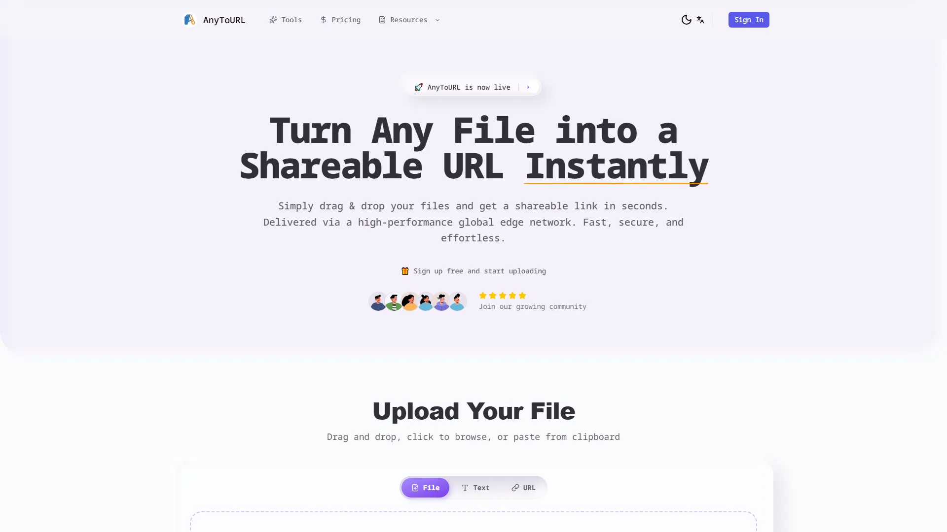 AnyToURL is a file‑to‑URL generator, online file host, and instant sharing service that turns any document, image, video, or code snippet into a short, shareable link in under 0.3 seconds on average. Powered by Cloudflare’s global edge network, it delivers 99.99 % uptime and sub‑50 ms latency to users across 200+ PoPs.
