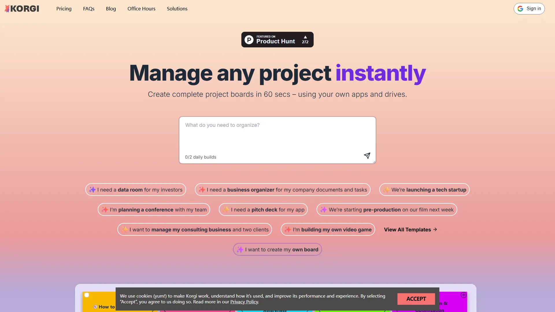 Korgi is anAI‑powered workspace that instantly generates full‑featured project boards inunder 60 seconds. Variant keywords such as project board creator, team collaboration hub, and smart data room all point to the same powerhouse.