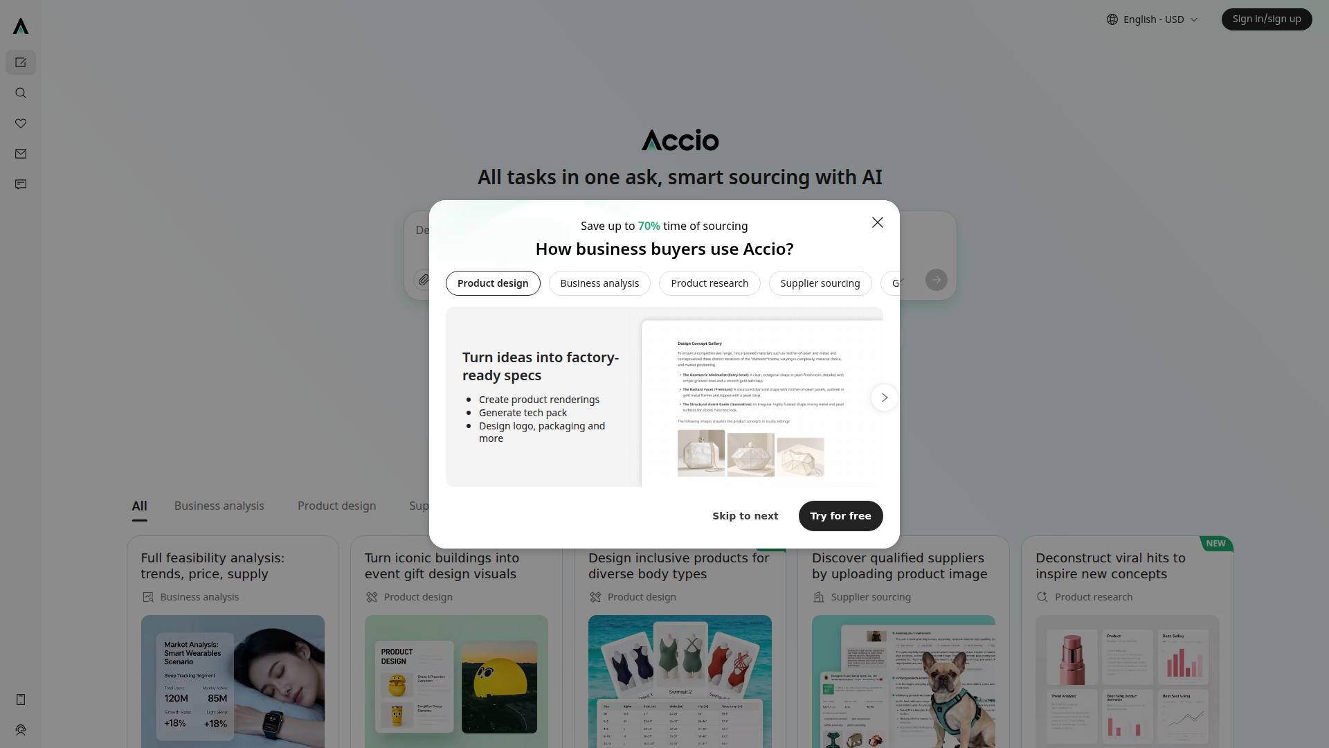 Accio ist ein KI-gestützter Business-Agent für geschäftliche Einkäufer, präsentiert in Partnerschaft mit Alibaba. Er scheint für Teams konzipiert zu sein, die in Produktdesign, Geschäftsanalyse, Produktforschung, Lieferantensuche und Go-to-Market-Planung tätig sind, mit einem Workflow, der darauf ausgerichtet ist, eine einzelne Anfrage in mehrstufige Ergebnisse über Beschaffungs- und Produktentwicklungsaufgaben hinweg umzuwandeln.
