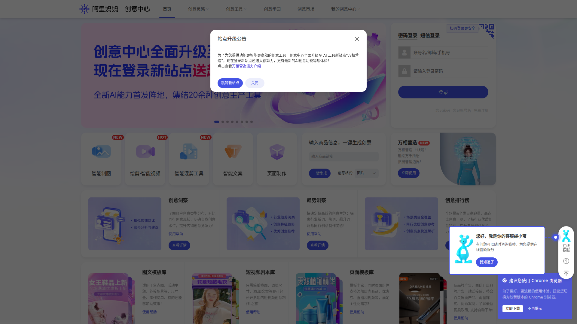 Den Seiteninformationen nach ist das Produkt eher als Workbench für E-Commerce-Werbekreation positioniert als als reine Designsoftware. Der Kernprozess ist: Produktinformationen eingeben, um Creatives zu generieren, anschließend mit Vorlagen und Skripten Bildmaterial oder Kurzvideos erstellen und dann über Creative Insights, Trendanalysen und Rankings Wettbewerber und Branchenrichtungen verstehen. Bei Bedarf kann über den Marktplatz für Kreativdienstleistungen zusätzliche manuelle Produktionskapazität eingebunden werden. Die Seite weist außerdem darauf hin, dass die Funktionen der Website derzeit auf die neue AI-Tool-Website „Wanxiang Yingzao“ migriert werden.