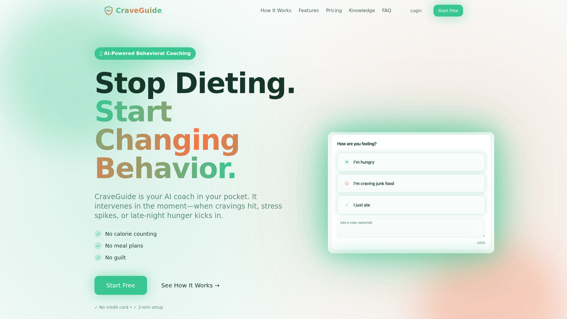 CraveGuide ist eine KI-gestützte Verhaltenscoaching-App mit Fokus auf Essgewohnheiten und verhaltensbezogene Veränderungen rund um Gewichtsabnahme. Sie positioniert sich als Alternative zu herkömmlichen Diät-Tools, indem sie Interventionen im Moment der Entscheidung in den Vordergrund stellt statt Kalorienzählen, Ernährungsplänen oder restriktiven Lebensmittelregeln.