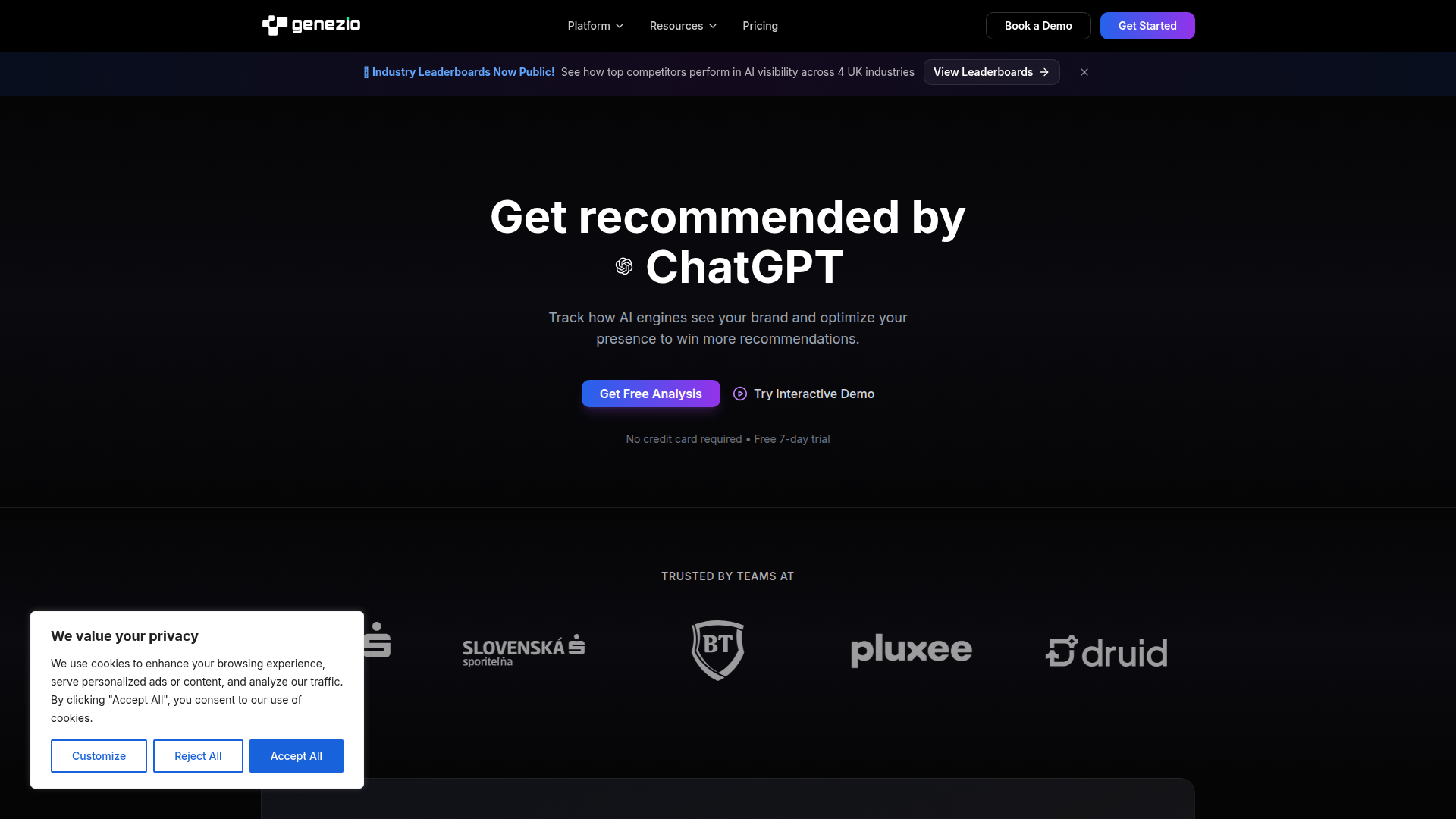 Der zentrale Workflow konzentriert sich auf die Nachverfolgung von KI-Sichtbarkeit, Empfehlungsraten, Zitierungen, Stimmung und Markenwahrnehmung und wandelt diese Signale dann in priorisierte Maßnahmen wie Website-Aktualisierungen, Content-Verbesserungen und Korrekturen von Zitierungen um. Basierend auf der Seite scheint Genezio als unternehmensorientiertes Analyse- und Optimierungsprodukt für Marken positioniert zu sein, die verbessern möchten, wie sie in KI-generierten Antworten und Empfehlungen erscheinen.
