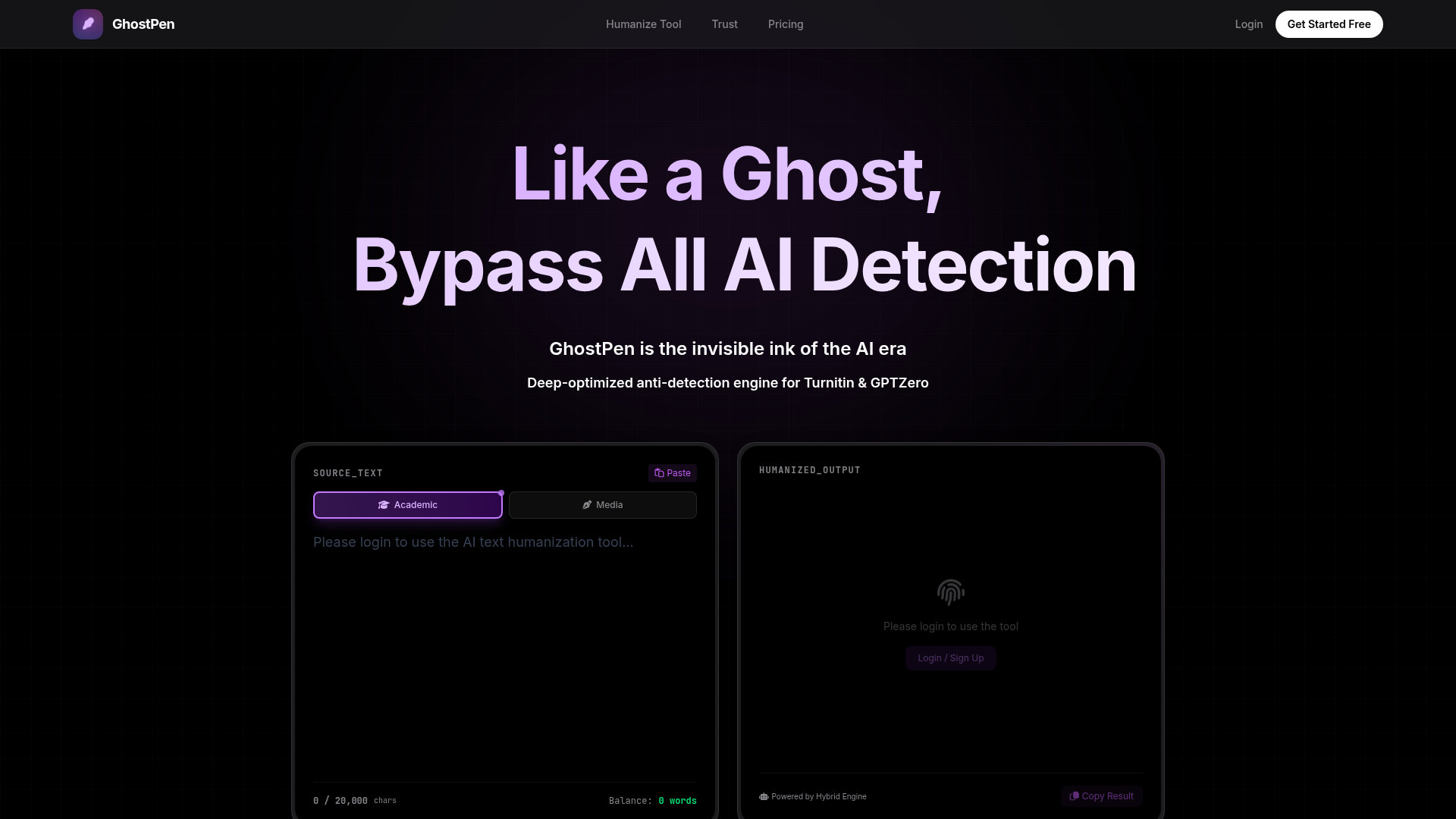 GhostPen ist ein Tool zur Vermenschlichung von Texten, das darauf ausgelegt ist, KI-generierte Inhalte so umzuschreiben, dass sie eher wie natürlich von Menschen verfasste Texte wirken. Die Seite präsentiert es als Anti-Erkennungs-Produkt, das Signale reduzieren soll, die KI-Inhaltsdetektoren wie Turnitin, GPTZero und Originality.ai auslösen, während die ursprüngliche Bedeutung des Textes erhalten bleibt.