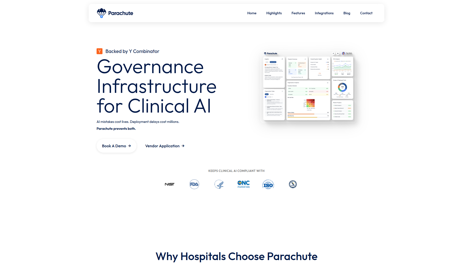 Parachute ist Governance-Infrastruktur für klinische KI. Es wurde für Krankenhäuser entwickelt, die einen strukturierten Weg benötigen, um in klinischen Umgebungen eingesetzte KI-Tools zu prüfen, zu genehmigen, bereitzustellen, zu überwachen und zu dokumentieren.