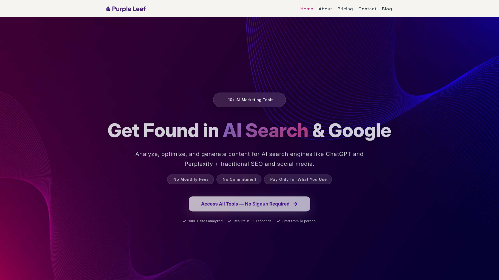 Purple Leaf ist eine webbasierte Sammlung von KI-Marketing-Tools für Website-Optimierung, Sichtbarkeit in der KI-Suche, traditionelle SEO und die Generierung von Social-Media-Inhalten. Es scheint sich an Marketer, SEO-Teams, Entwickler, Publisher, Website-Betreiber, Gründer und Social-Media-Manager zu richten, die schnelle Analysen auf Seitenebene und Content-Ausgaben benötigen, ohne sich an ein Abonnement zu binden.