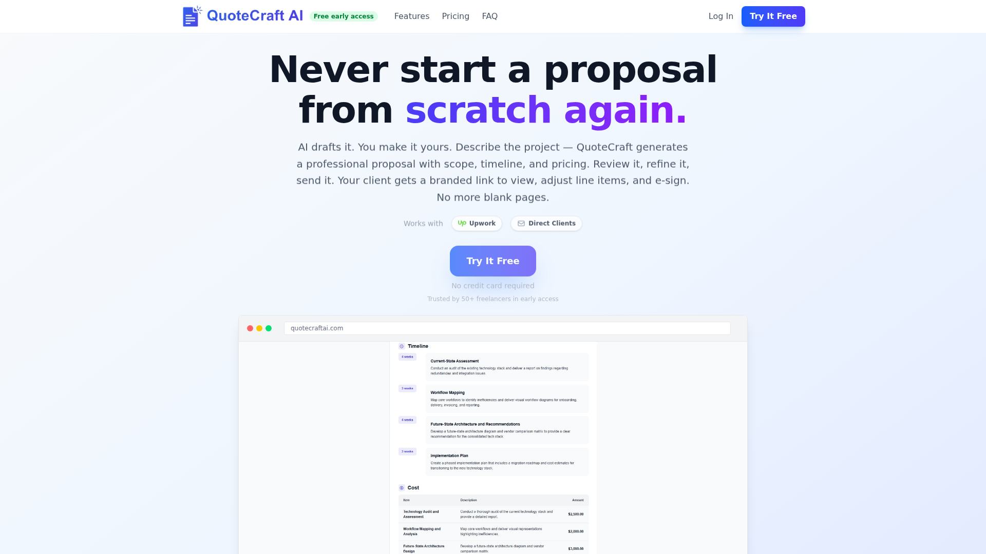 Das Produkt scheint als Workflow-Tool für Selbstständige positioniert zu sein, die mit Direktkunden und Upwork-Möglichkeiten arbeiten. Sein zentraler Nutzen besteht darin, die Bearbeitungszeit für Angebote nach einem Meeting zu verkürzen und Kunden gleichzeitig einen gemeinsamen Link bereitzustellen, über den sie das Angebot prüfen, Positionen anpassen und elektronisch unterschreiben können, ohne einen langen E-Mail-Austausch.