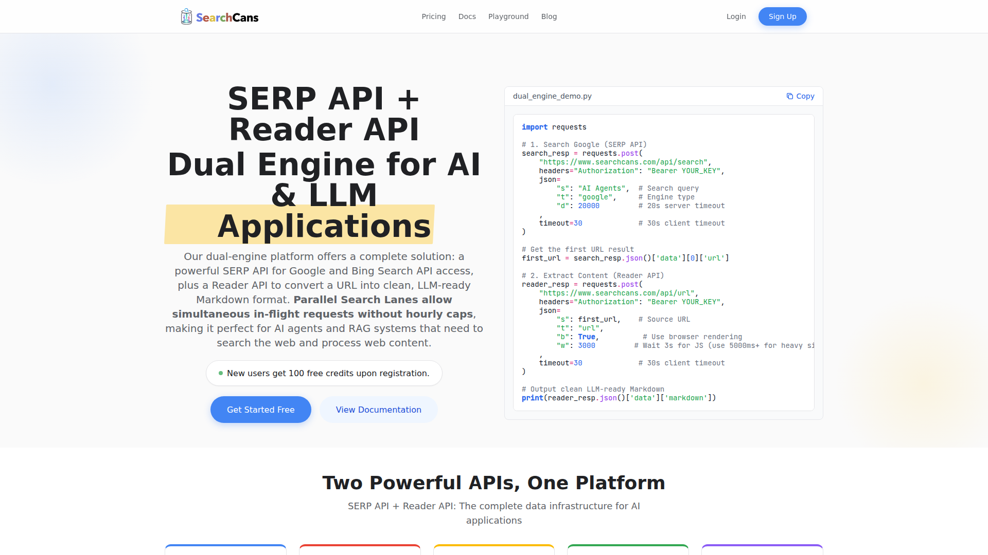 SearchCans ist eine auf Entwickler ausgerichtete API-Plattform, die zwei Web-Datendienste kombiniert: eine SERP-API für Google- und Bing-Suchergebnisse sowie eine Reader-API, die URLs für die nachgelagerte Nutzung durch LLMs in sauberes Markdown umwandelt. Der auf der Website gezeigte Kern-Workflow besteht darin, das Web programmatisch zu durchsuchen, eine Ergebnis-URL zu extrahieren und anschließend die Zielseite in strukturierte, maschinenfreundliche Inhalte zu transformieren.