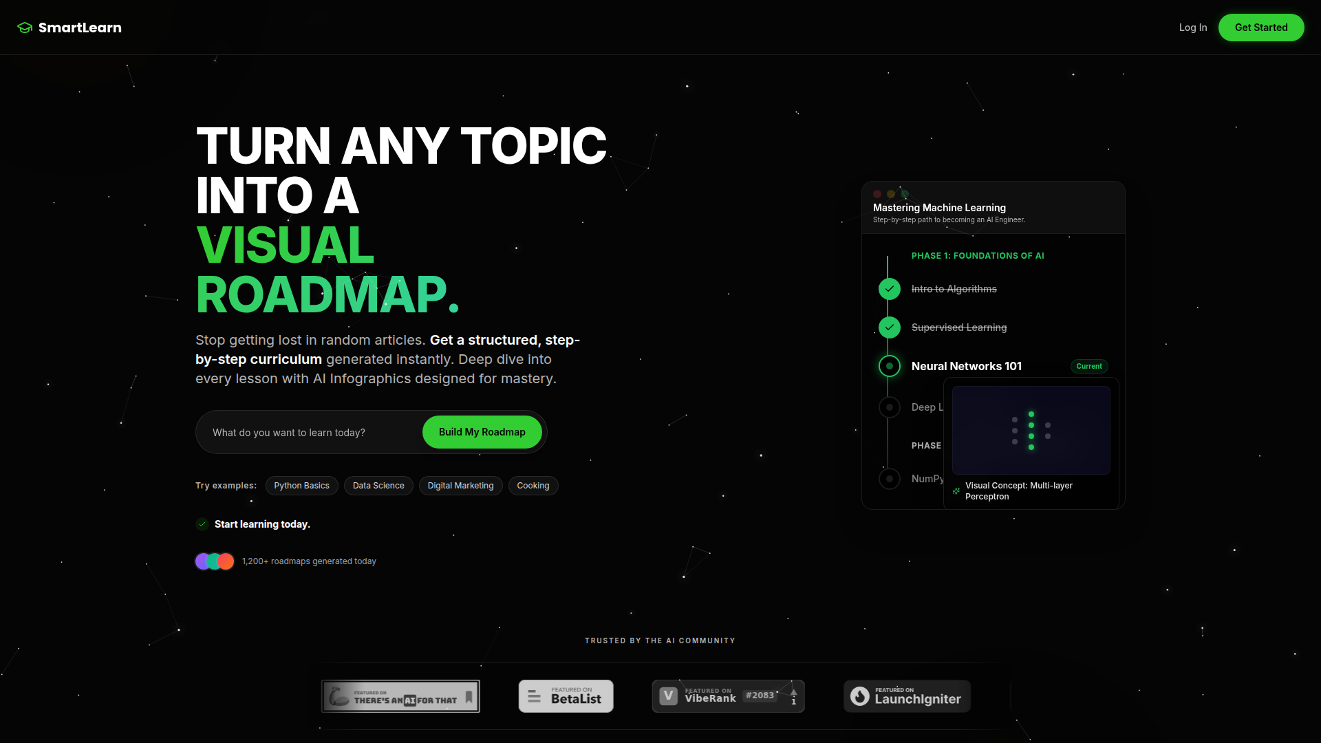 SmartLearn ist ein KI-basiertes Lerntool, das ein vom Nutzer eingegebenes Thema in eine visuelle, schrittweise Roadmap umwandelt. Die Seite stellt es als Möglichkeit dar, fragmentiertes Selbststudium über zufällige Artikel durch ein strukturierteres Curriculum zu ersetzen, unterstützt durch KI-generierte visuelle Materialien.