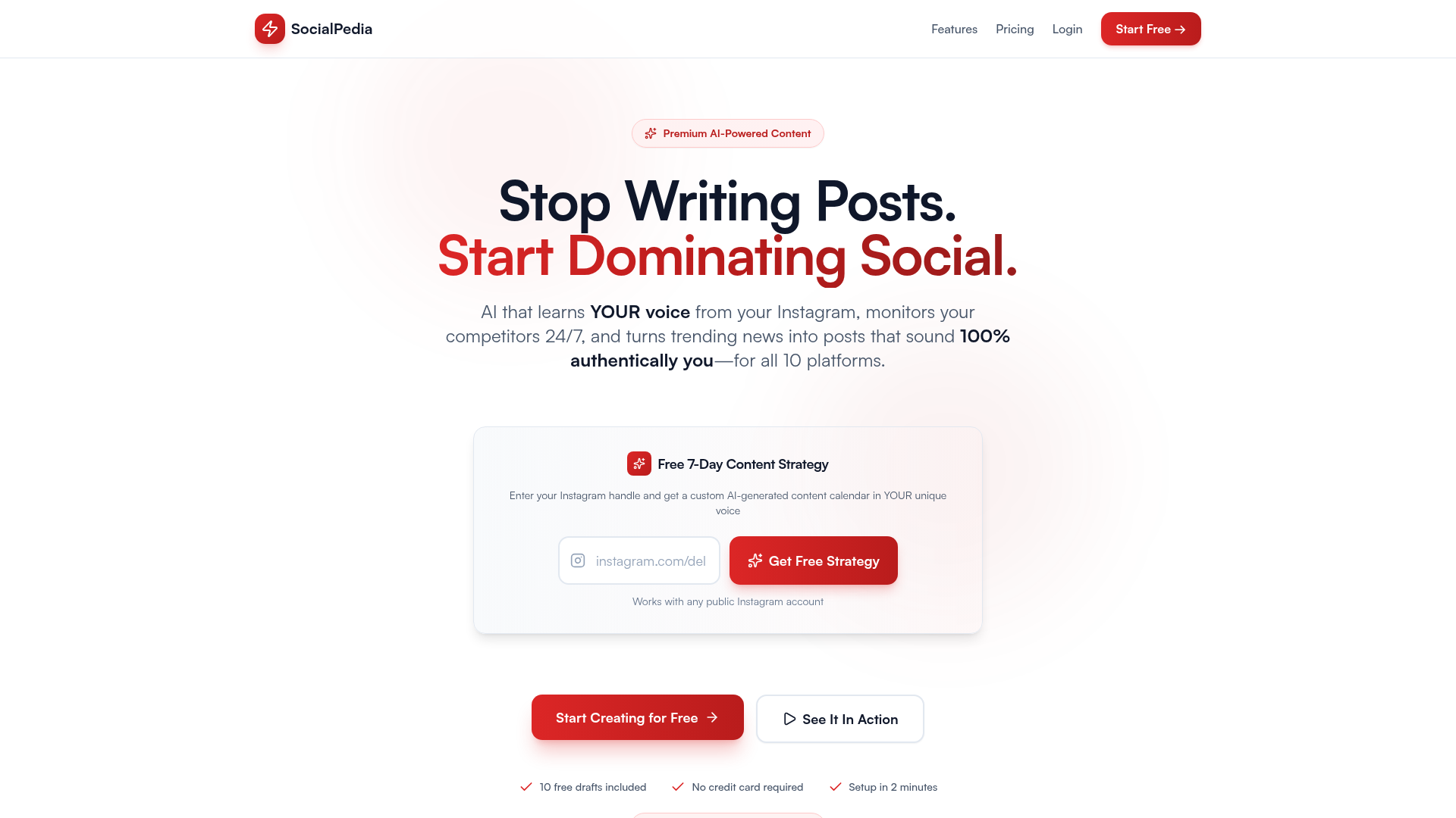 SocialPedia ist ein KI-Tool zur Erstellung von Social-Media-Inhalten, das dafür entwickelt wurde, Beiträge in der eigenen Markenstimme über mehrere soziale Plattformen hinweg zu erstellen. Laut der Seite lernt es Ton und Stil aus einem öffentlichen Instagram-Konto und nutzt dieses Profil anschließend, um Entwürfe auf Basis von Themen, Produktdetails, Wettbewerberaktivitäten und Branchennachrichten zu generieren.