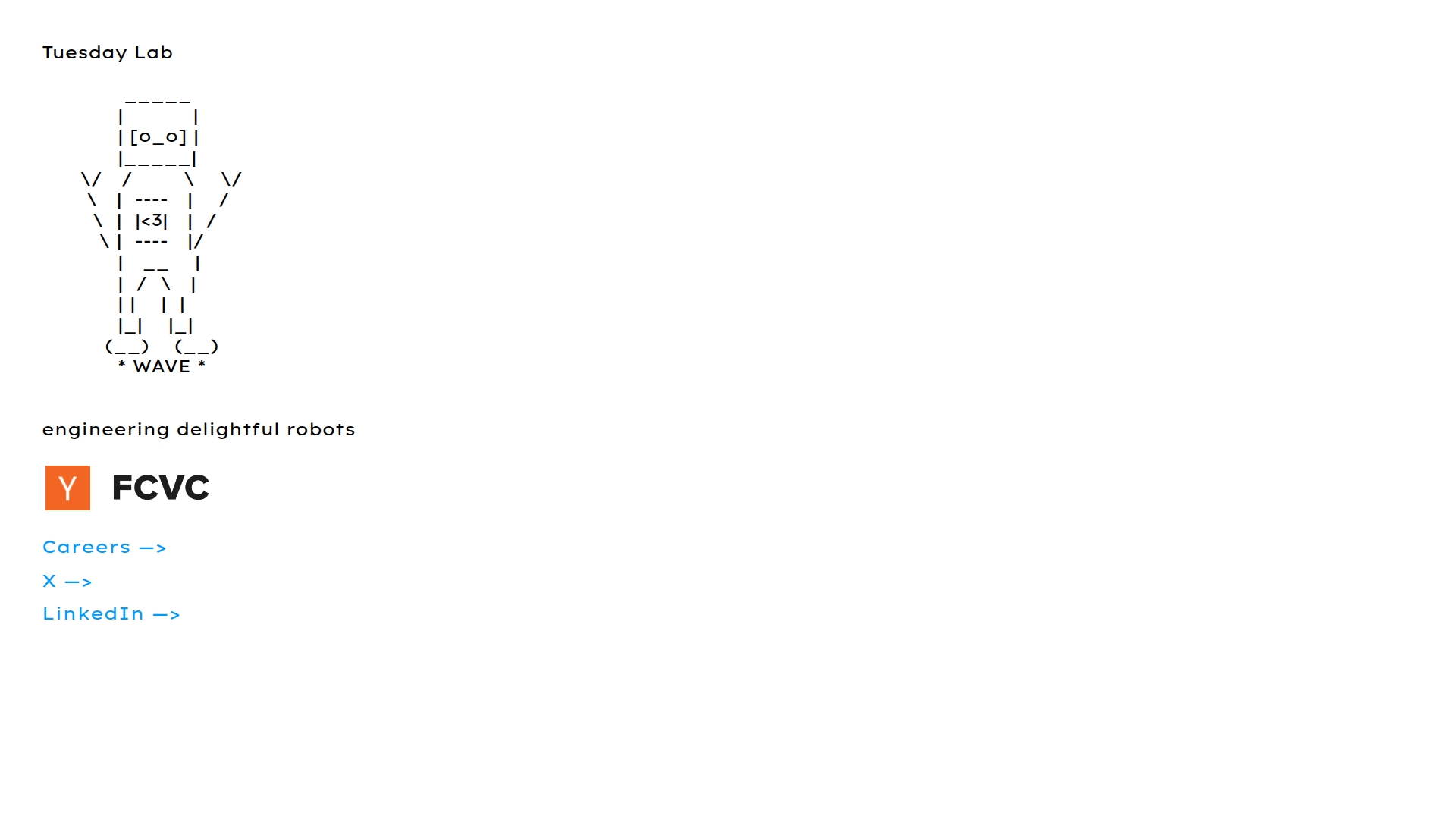 Tuesday Lab scheint ein auf Engineering fokussiertes Robotikunternehmen zu sein, dessen Markenbotschaft auf „engineering delightful robots“ ausgerichtet ist. Basierend auf den bereitgestellten Seiteninhalten präsentiert es sich als Labor oder Studio, das Roboterprodukte entwickelt, mit nur wenigen öffentlichen Details zu konkreten Angeboten.