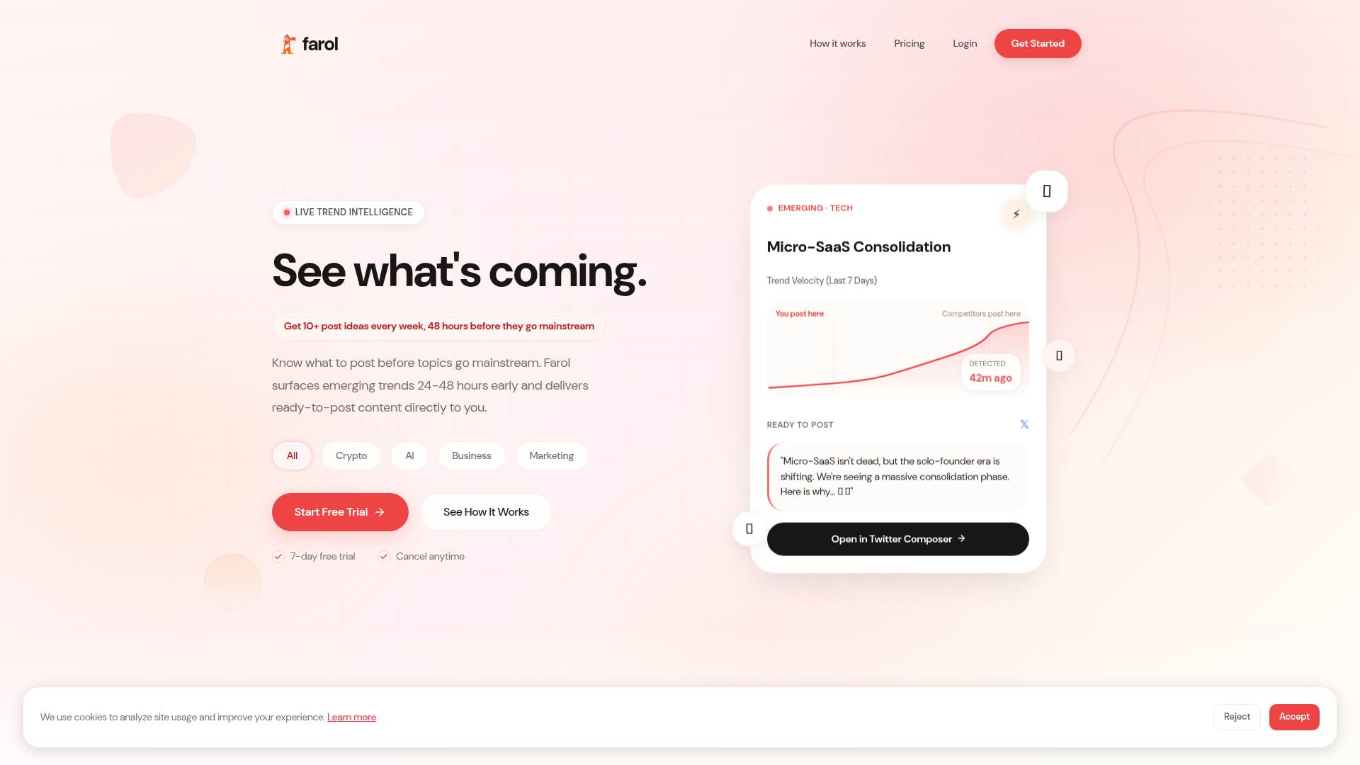 Farol ist ein Trend-Intelligence-Produkt für Menschen, die Social Content als Wachstumskanal nutzen, insbesondere Creators, Gründer, Newsletter-Autoren und Marketing-Fachleute. Es überwacht Hunderte einflussreicher Twitter/X-Accounts, gruppiert aufkommende Diskussionen und soll Themen 24–48 Stunden bevor sie zum Mainstream werden sichtbar machen.