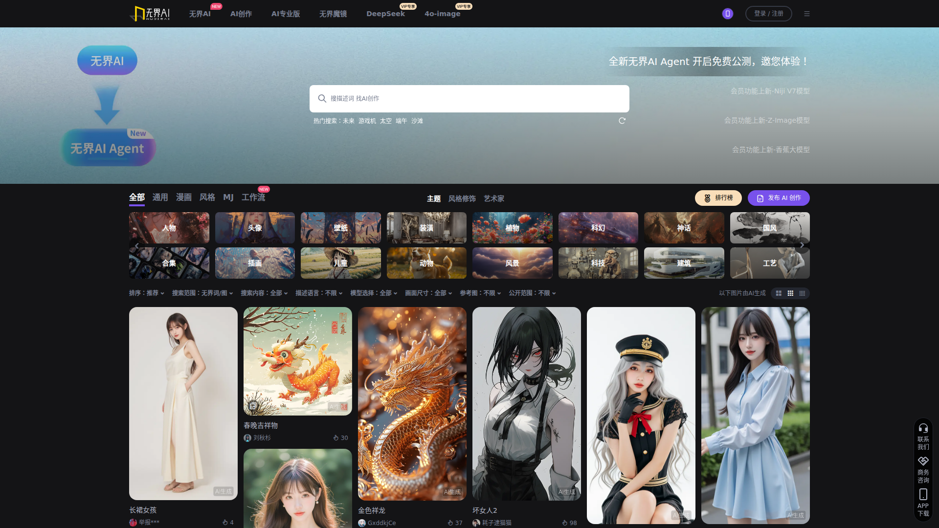 - Modellauswahl und Mitgliedermodelle: Die Seite verweist auf mehrere Modelle wie Niji V7, Z-Image, Banana-Modell, DeepSeek und 4o-image. Das deutet darauf hin, dass Nutzer zwischen verschiedenen Generierungs-Engines für unterschiedliche visuelle Stile oder Aufgaben wählen können.
