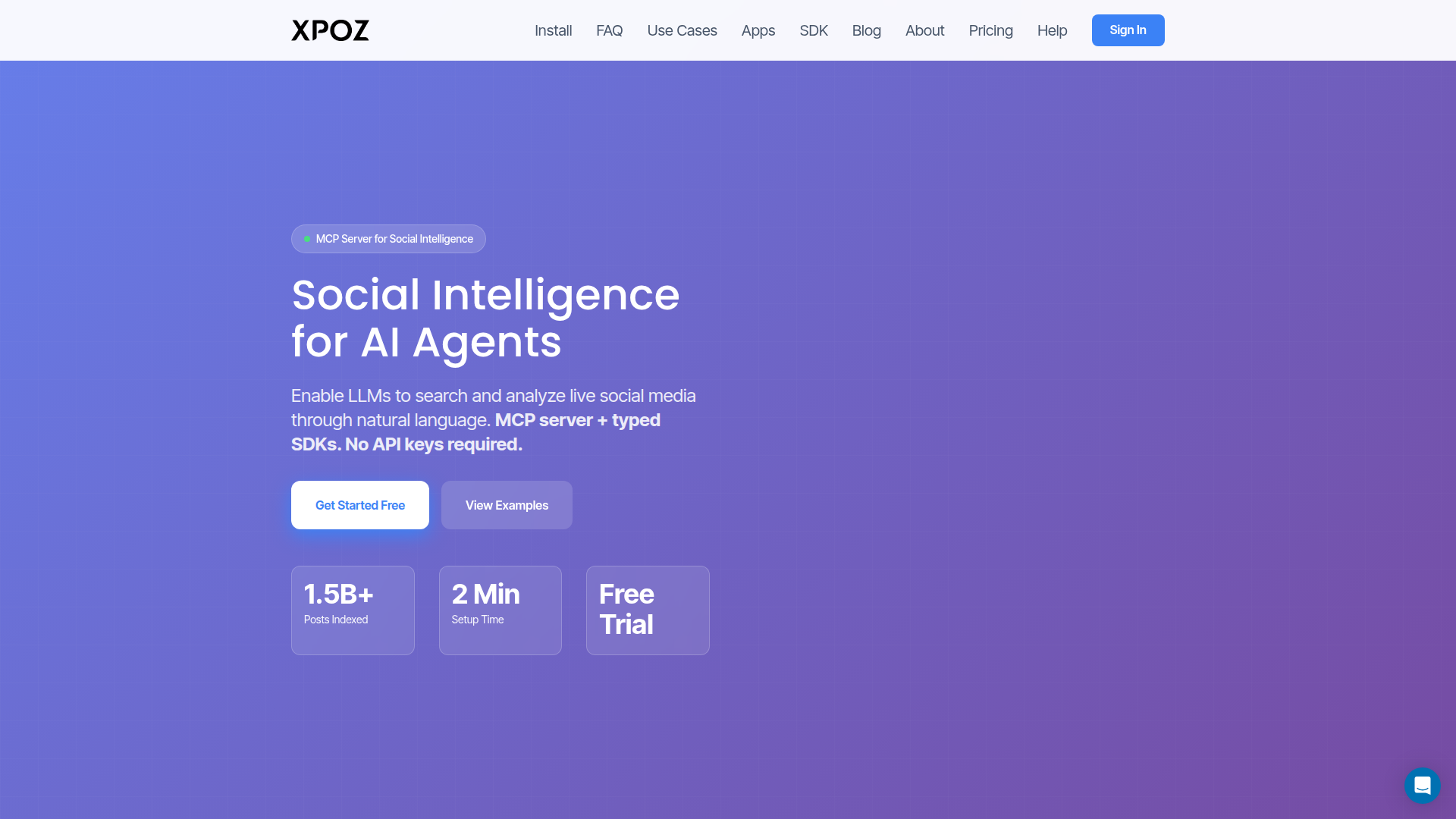 Xpoz ist ein Produkt für soziale Intelligenz für KI-Agenten und Entwickler. Es bietet live und historische soziale Mediendaten über einen Remote-MCP-Server und typisierte SDKs an, damit Sprachmodelle Beiträge, Profile, Trends und Engagement mithilfe natürlicher Sprache oder Code suchen, filtern und analysieren können.