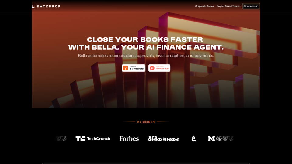 Backdrop ist eine Finanzautomatisierungsplattform mit einem KI-Agenten namens Bella, der Unternehmens- und projektbasierte Teams dabei unterstützt, ihre Abschlüsse schneller zu erstellen, indem Abstimmungen, Genehmigungen, Rechnungserfassung, Bestellabgleich, Lieferanten-Onboarding, Zahlungen und die ERP-Synchronisierung automatisiert werden. Für Finanz- und Buchhaltungsteams kann diese Art der KI-gestützten Workflow-Automatisierung den manuellen Aufwand am Monatsende verringern und die Geschwindigkeit und Konsistenz in der Kreditorenbuchhaltung und bei Abschlussprozessen verbessern.