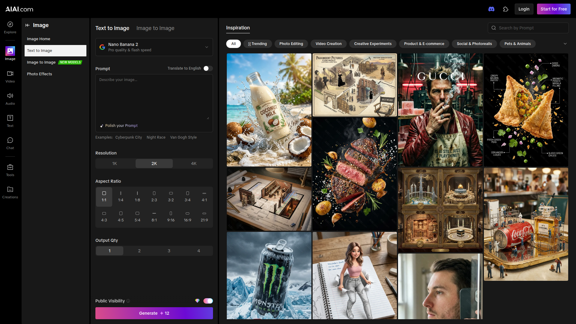 AIAI.com offers a browser-based AI image generator that turns text prompts into images. It appears designed for creators, marketers, designers, and general users who need fast visual ideation, with options for prompt refinement, model selection, resolution, aspect ratio, output quantity, and public visibility.