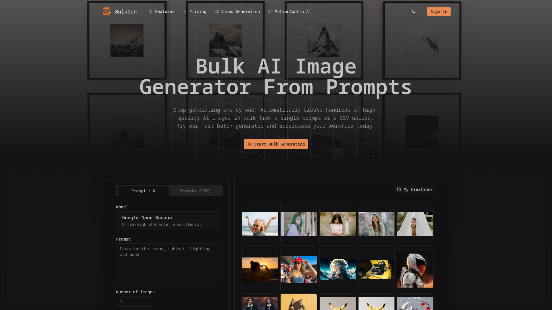BulkGen is an AI bulk image generator built for users who need to create many images from text prompts without generating them one at a time. It supports two primary workflows: creating multiple variations from a single prompt and generating images from a CSV file containing many different prompts.