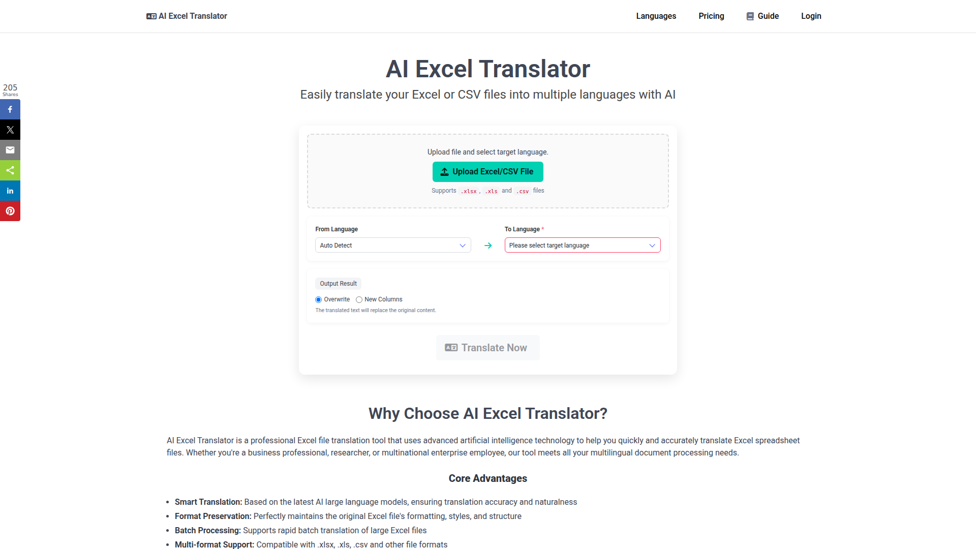 The product appears suited to business professionals, researchers, analysts, and multinational teams that work with multilingual spreadsheet data. Its core workflow is straightforward: upload an .xlsx, .xls, or .csv file, choose source and target languages, optionally select a specific cell range and output mode, then download the translated file.