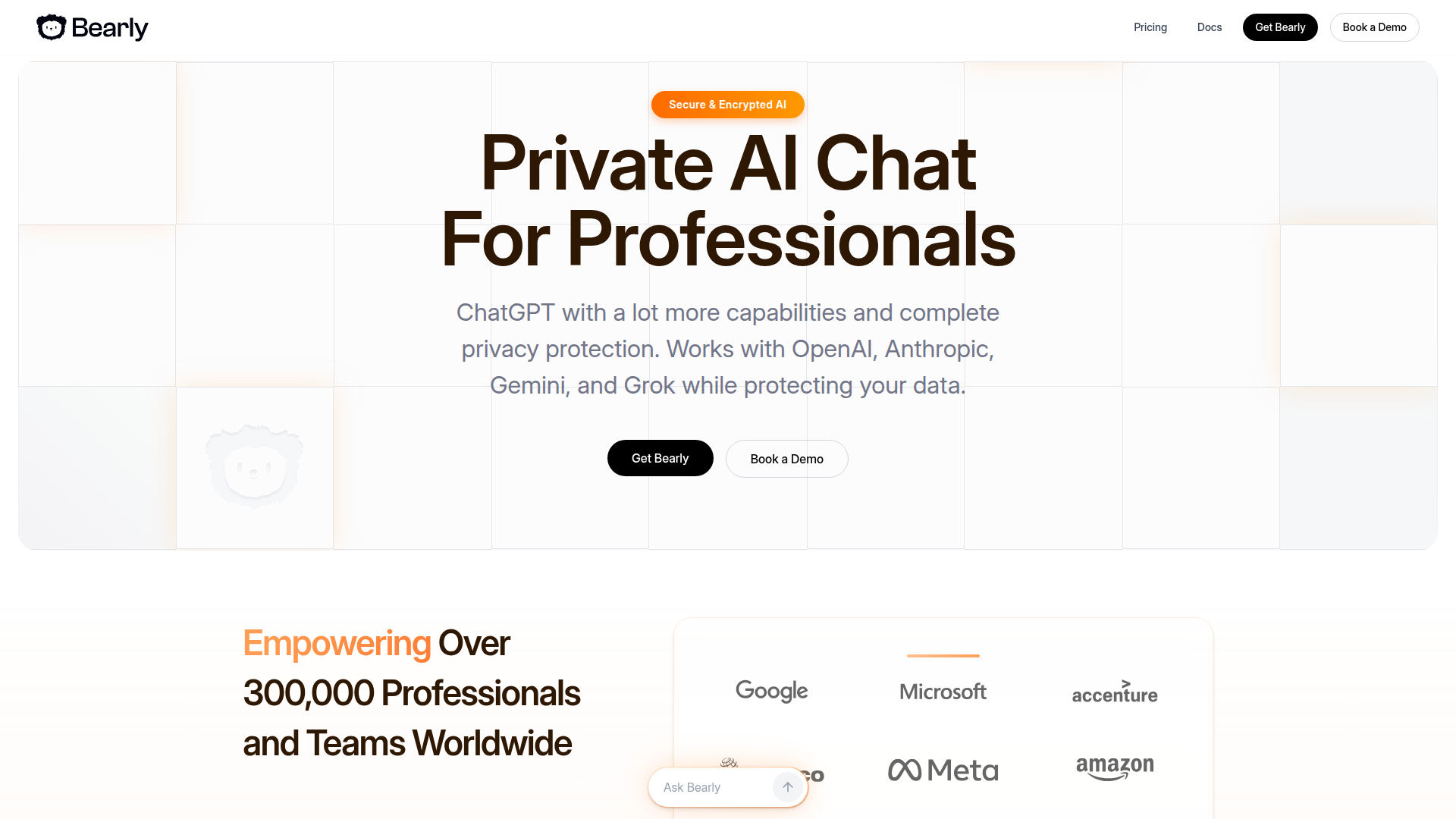 The product appears designed for organizations that want broad AI functionality without relying on standard consumer chat tools or exposing sensitive data unnecessarily. Its workflow centers on secure AI-assisted work: users interact with models, agents, code tools, shared canvases, and enterprise workflows while Bearly emphasizes encryption, anonymization, deployment flexibility, and administrative control.