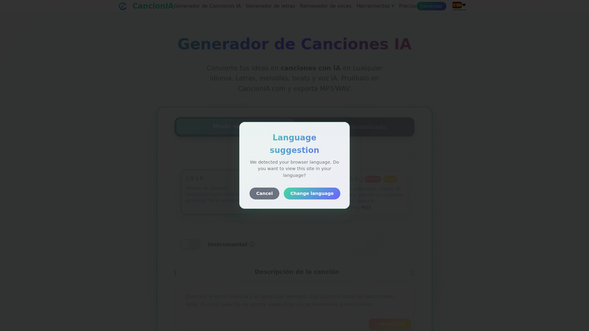 CancionIA.com is an AI music creation platform for generating songs, lyrics, instrumentals, and related media assets from text prompts or user-provided lyrics. It supports song creation in multiple languages and offers export options such as MP3 and WAV, along with additional tools like vocal removal, audio-to-MIDI conversion, music extension, and short music video creation.