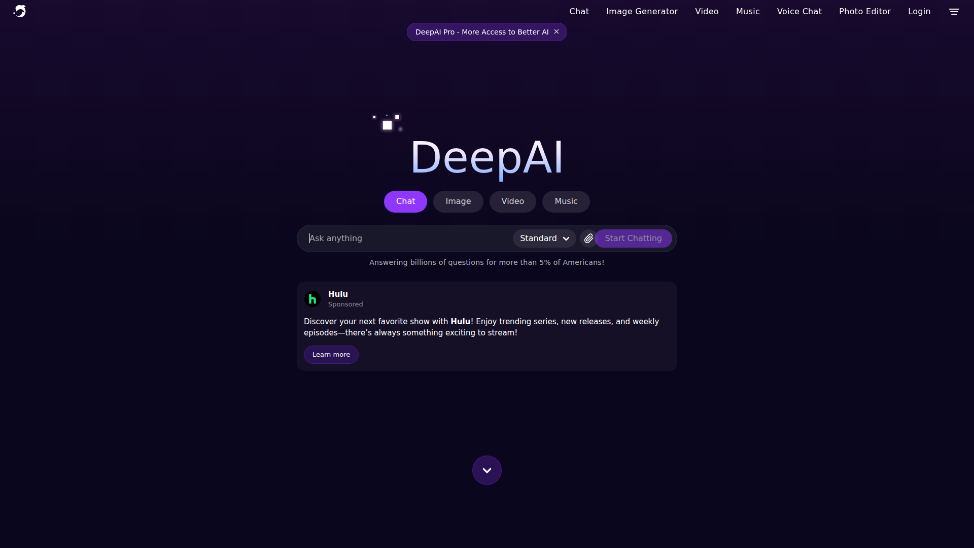 DeepAI is a browser-based AI platform for creating and editing media, chatting with AI, and accessing related tools from one interface. Based on the page, it serves a broad audience that includes hobbyists, professional artists, and developers who want simple access to image generation, video generation, music creation, voice chat, photo editing, and AI chat.