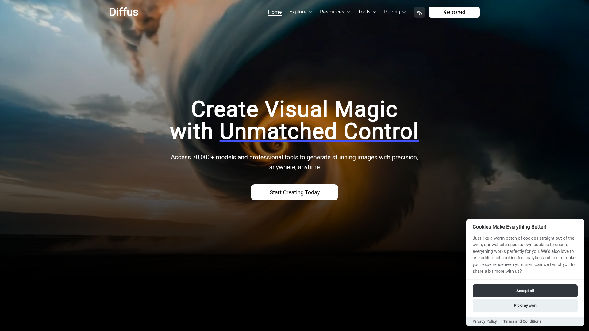 Diffus is a browser-based AI image generation platform focused on professional control and model flexibility. Based on the page, it offers access to a large library of image-generation models and tools for creating and editing images with more precision than a basic prompt-only generator.