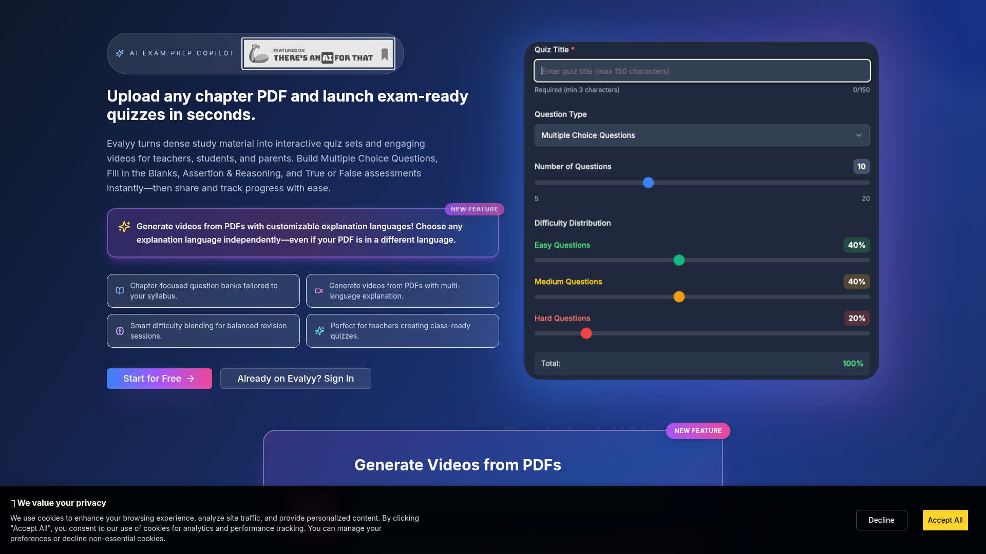 Evalyy is an AI-powered study content platform that converts chapter PDFs into exam-preparation materials. Based on the page, it is designed for teachers, students, and parents who need faster ways to create quizzes, revision aids, and educational videos from existing study material.