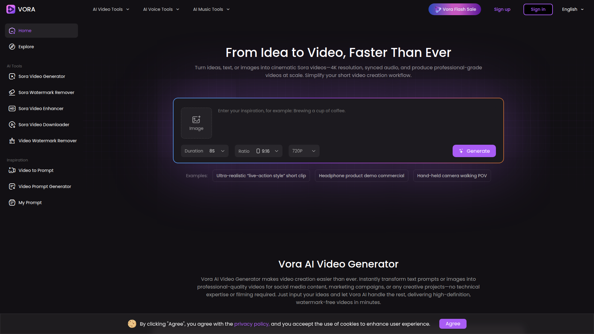 Vora is a web-based AI video creation toolkit centered on generating short videos from text prompts or reference images. The page presents it as a way to create cinematic Sora-style videos with selectable duration, aspect ratio, and resolution, while also offering related tools for prompt generation, video enhancement, downloading, and watermark removal.