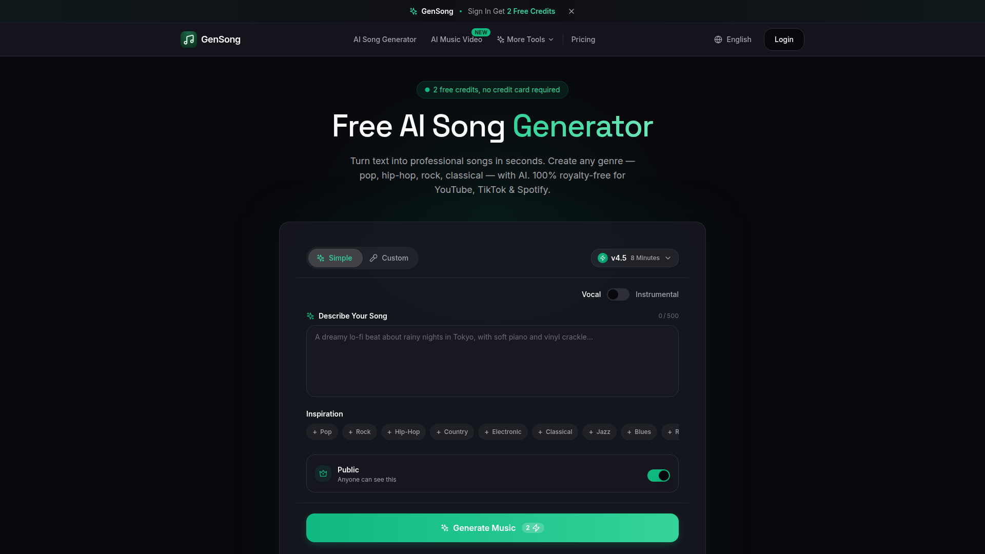 GenSong is a web-based AI song generation tool that turns text prompts or lyrics into complete songs with vocals or instrumentals. The page presents it as a fast, self-serve creator for users who want original music without traditional composition, recording, or production work.