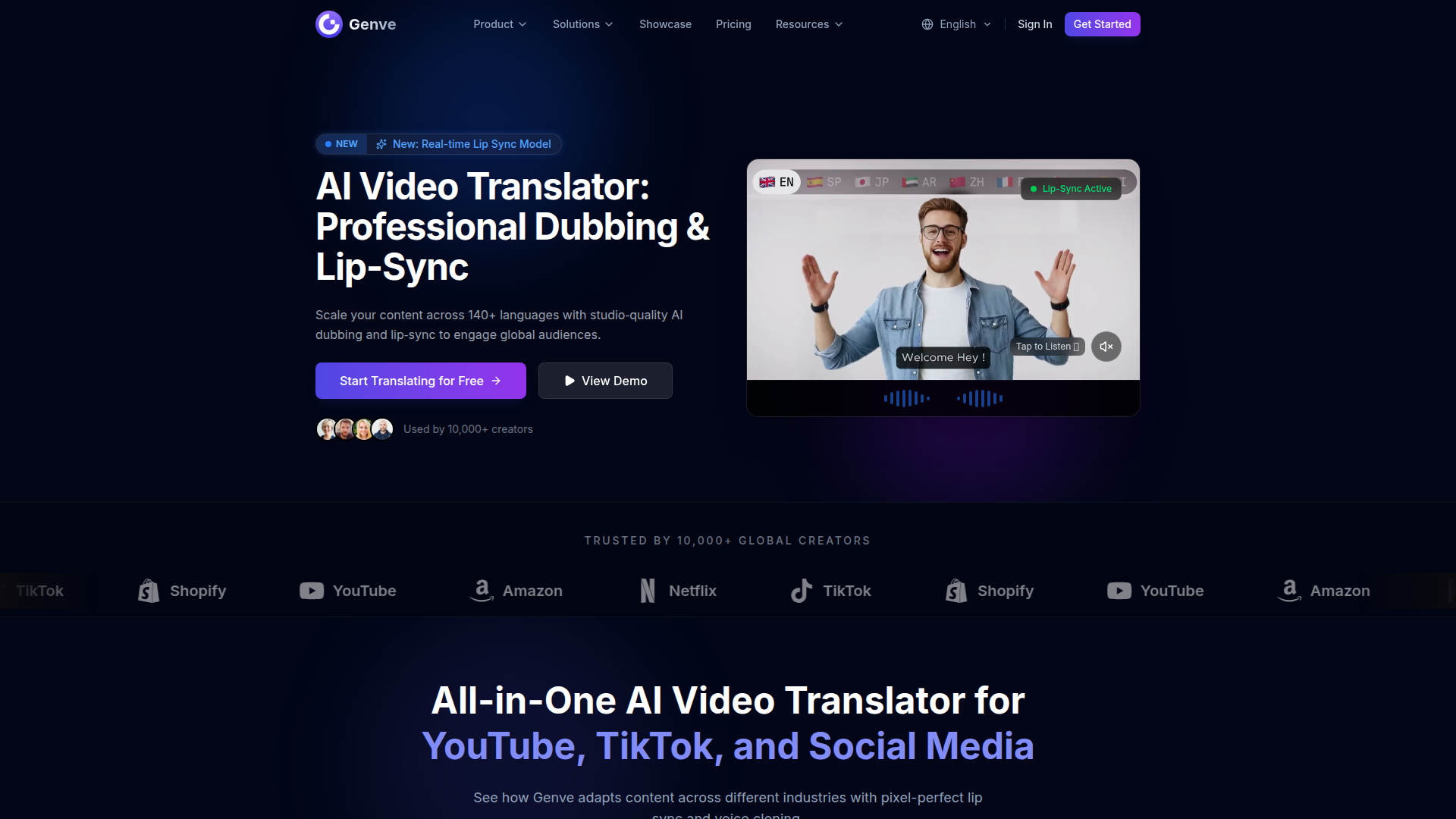 The product is positioned for creators, marketers, e-commerce teams, educators, and enterprise training teams that need faster multilingual video production. Based on the page, Genve is aimed at organizations and individuals replacing or reducing traditional dubbing studio work for social content, ads, product demos, courses, and internal training.