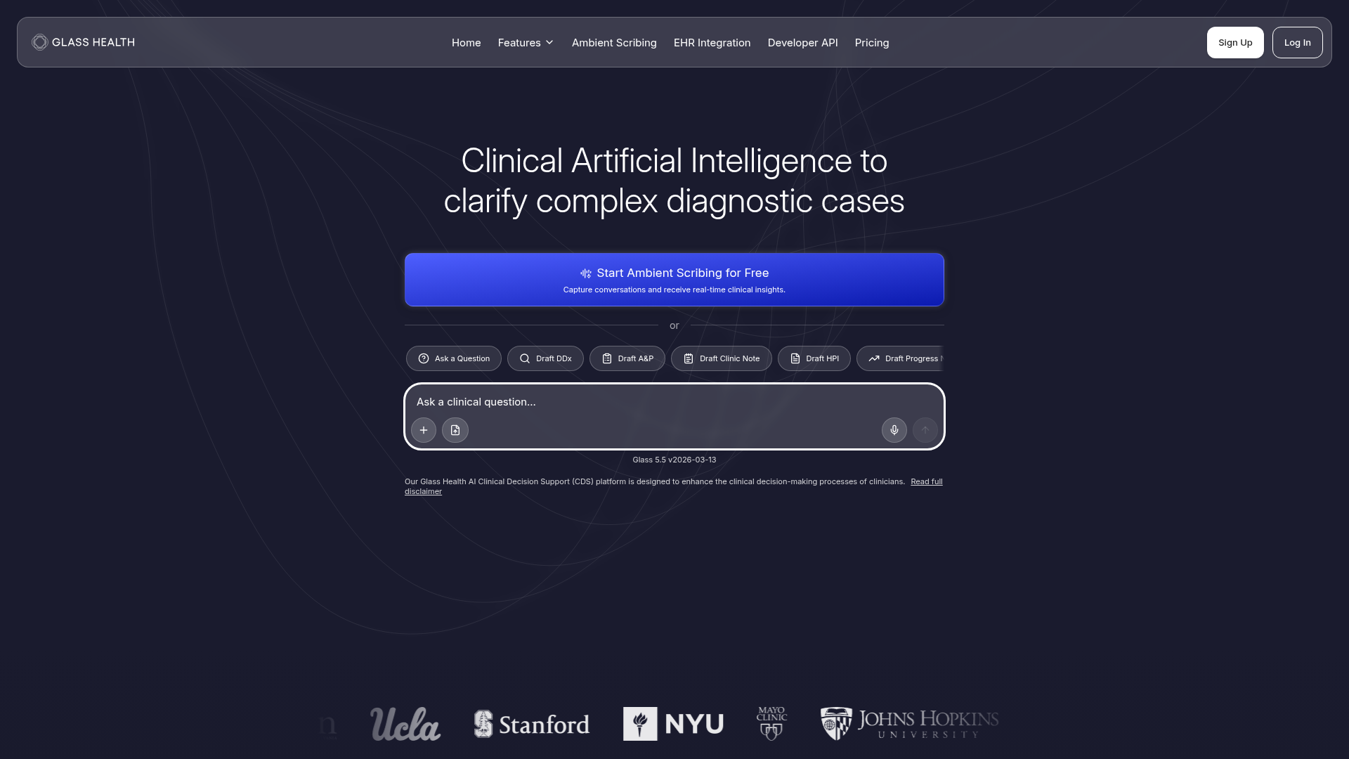 Glass Health is a clinical AI platform focused on two connected jobs: ambient scribing during patient encounters and clinical decision support at the point of care. It is aimed at clinicians and health systems that need help capturing visit conversations, generating structured documentation, and getting evidence-based guidance for diagnosis and treatment planning.