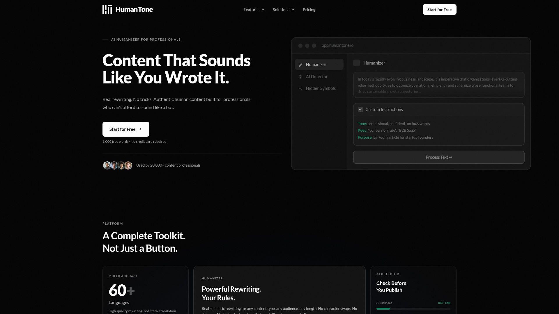 HumanTone is an AI writing refinement platform for professionals who use AI-generated drafts and need them to read more naturally. Its core product is an AI Humanizer that rewrites text at a semantic and structural level rather than relying on simple synonym swaps, with adjacent tools for AI detection and hidden character cleanup.