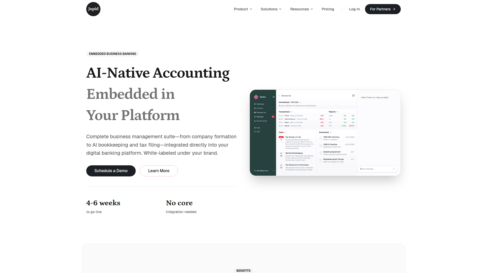 Its core workflow is to help businesses handle formation, day-to-day bookkeeping, and tax preparation through a conversational interface in channels like WhatsApp, iMessage, and embedded chat. For banks and digital banking platforms, Jupid appears positioned as an embedded SMB enablement layer that can be launched without core system changes, though the company also states it is a technology provider only and not a source of legal, accounting, or tax advice.