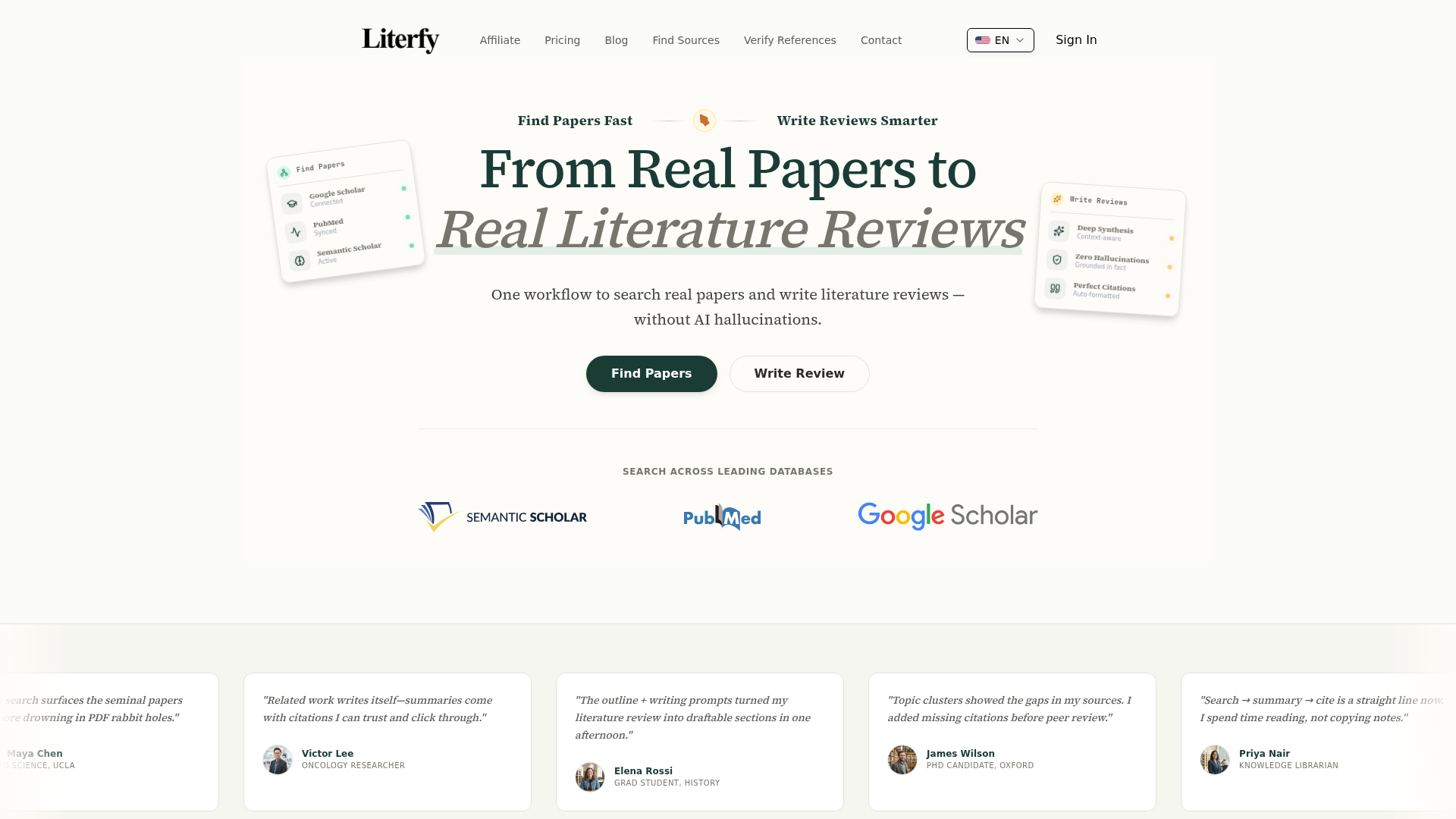 Literfy.ai is an AI-assisted literature review generator built for researchers and other knowledge workers who need to find papers, organize sources, and draft reviews from those sources in one workflow. The product centers on searching academic databases, shortlisting relevant papers, exporting citations, and generating outlines and review text tied back to selected references.