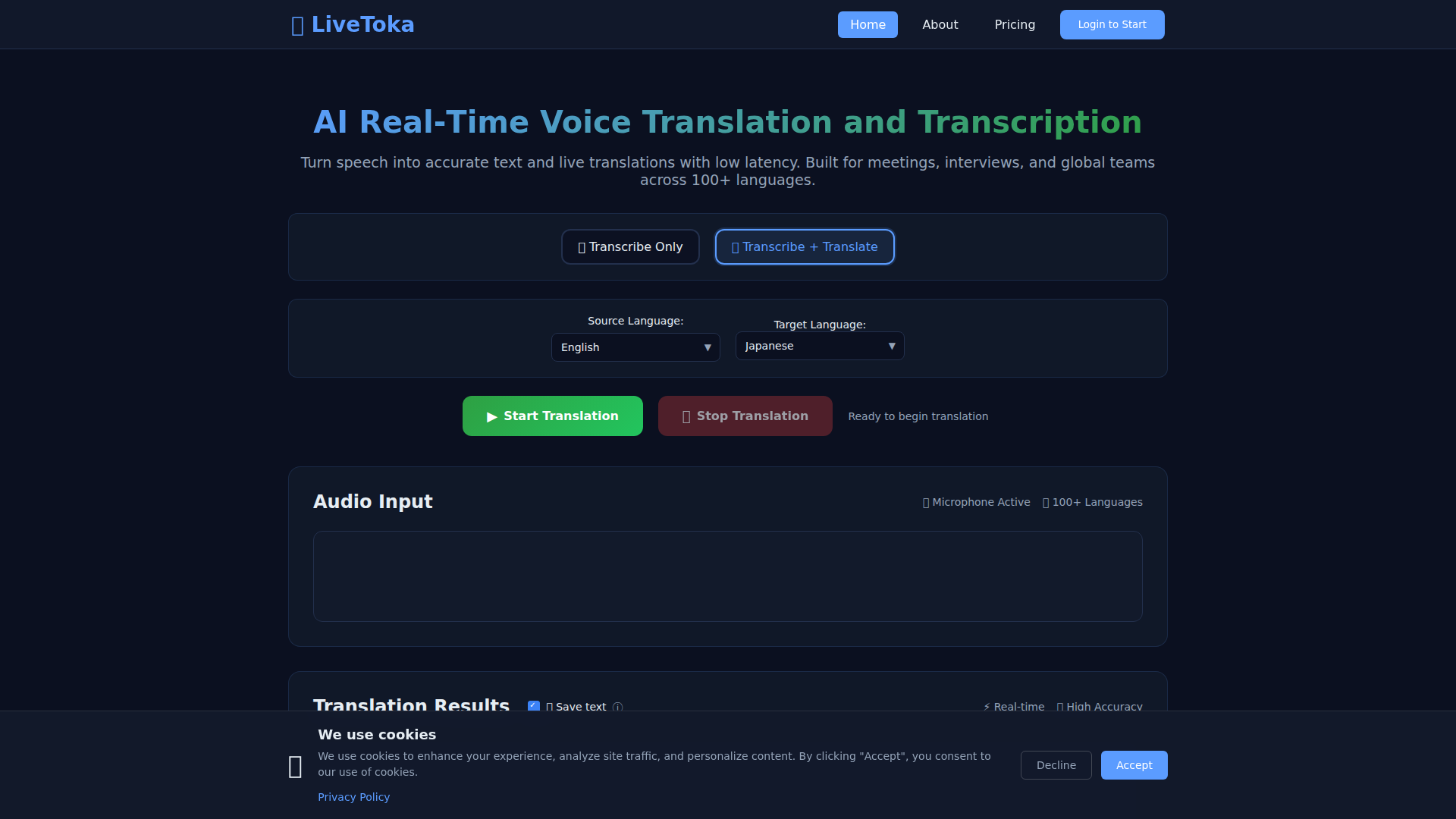 The core workflow is straightforward: users start the service, allow microphone access, choose transcription-only or transcription-plus-translation, and view text results as speech happens. Based on the page content, LiveToka is positioned as a low-latency communication layer for multilingual collaboration, with added meeting intelligence such as summaries, action items, and searchable history.