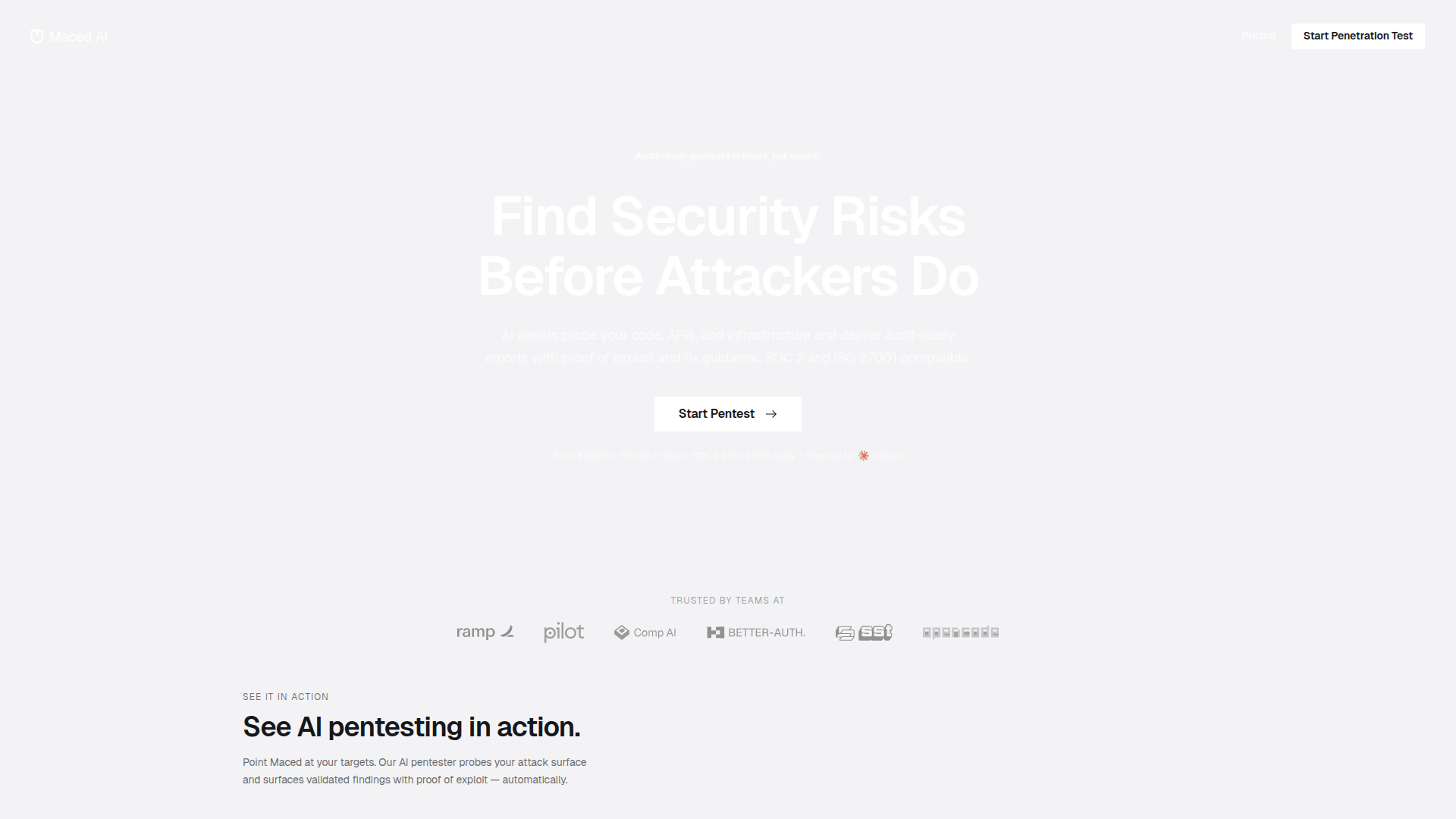 Maced AI is an autonomous AI penetration testing platform for modern engineering and security teams. It is designed to test code, APIs, web applications, cloud environments, and infrastructure, then return validated findings with proof of exploit, remediation guidance, and audit-ready reporting.