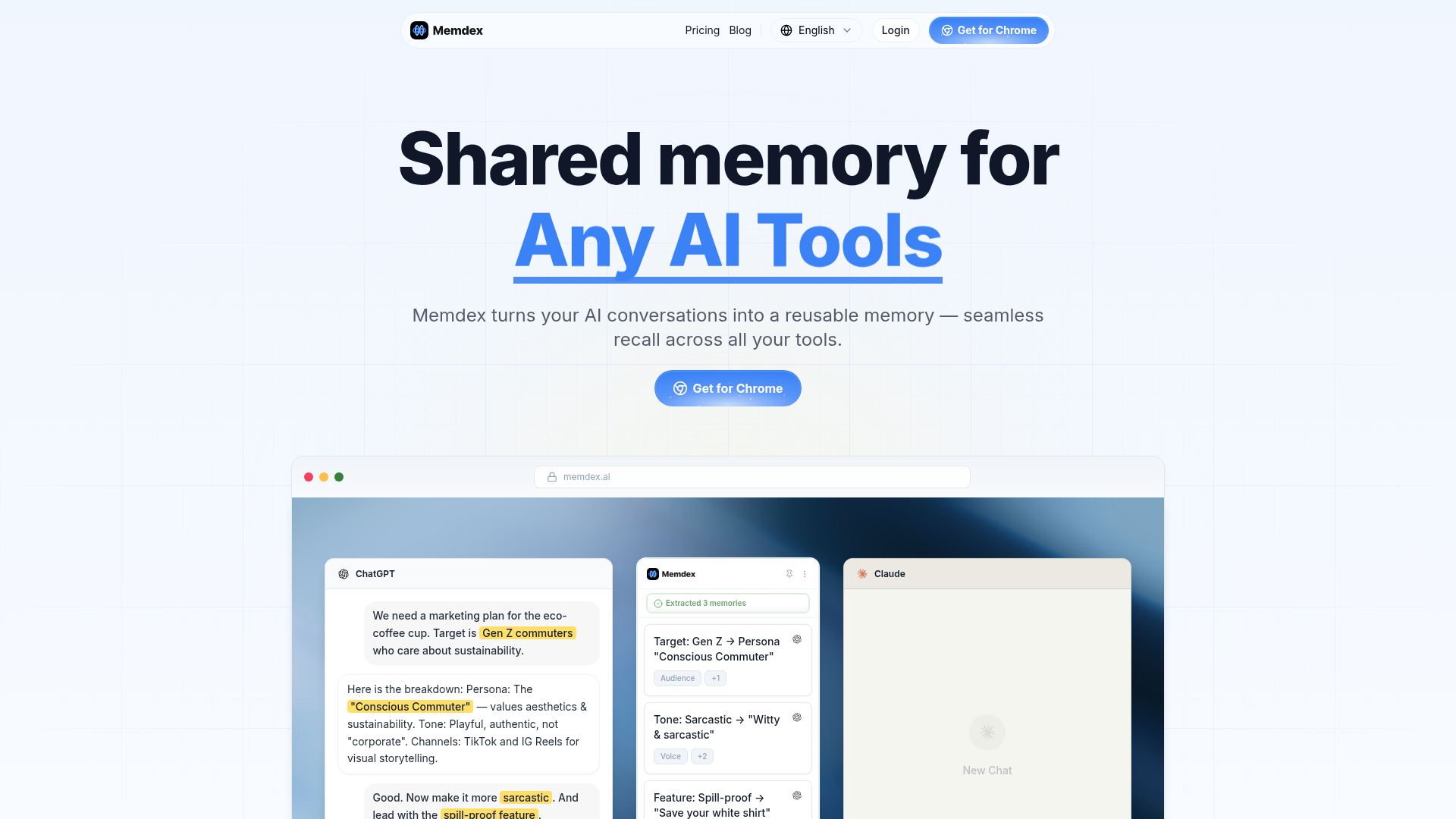Memdex is a browser extension that creates a shared memory layer across multiple AI tools, including ChatGPT, Claude, Gemini, Perplexity, and Grok. It is built for people who work across several AI assistants and want to reuse past context, decisions, preferences, and project details without re-explaining them in every new chat.