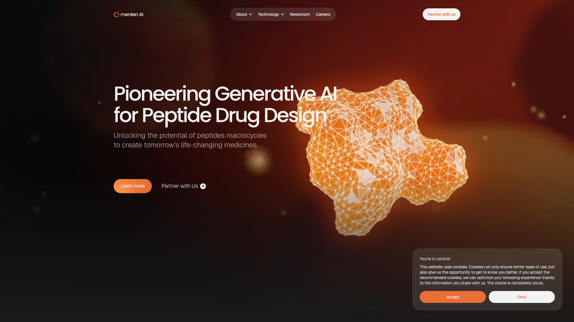 Menten AI is a biotechnology company focused on generative AI for peptide drug design, with a specific emphasis on peptide macrocycles. Its core product, MAUD 1.0, is presented as a platform that designs peptide macrocycles de novo for complex drug targets, including difficult protein-protein interfaces.