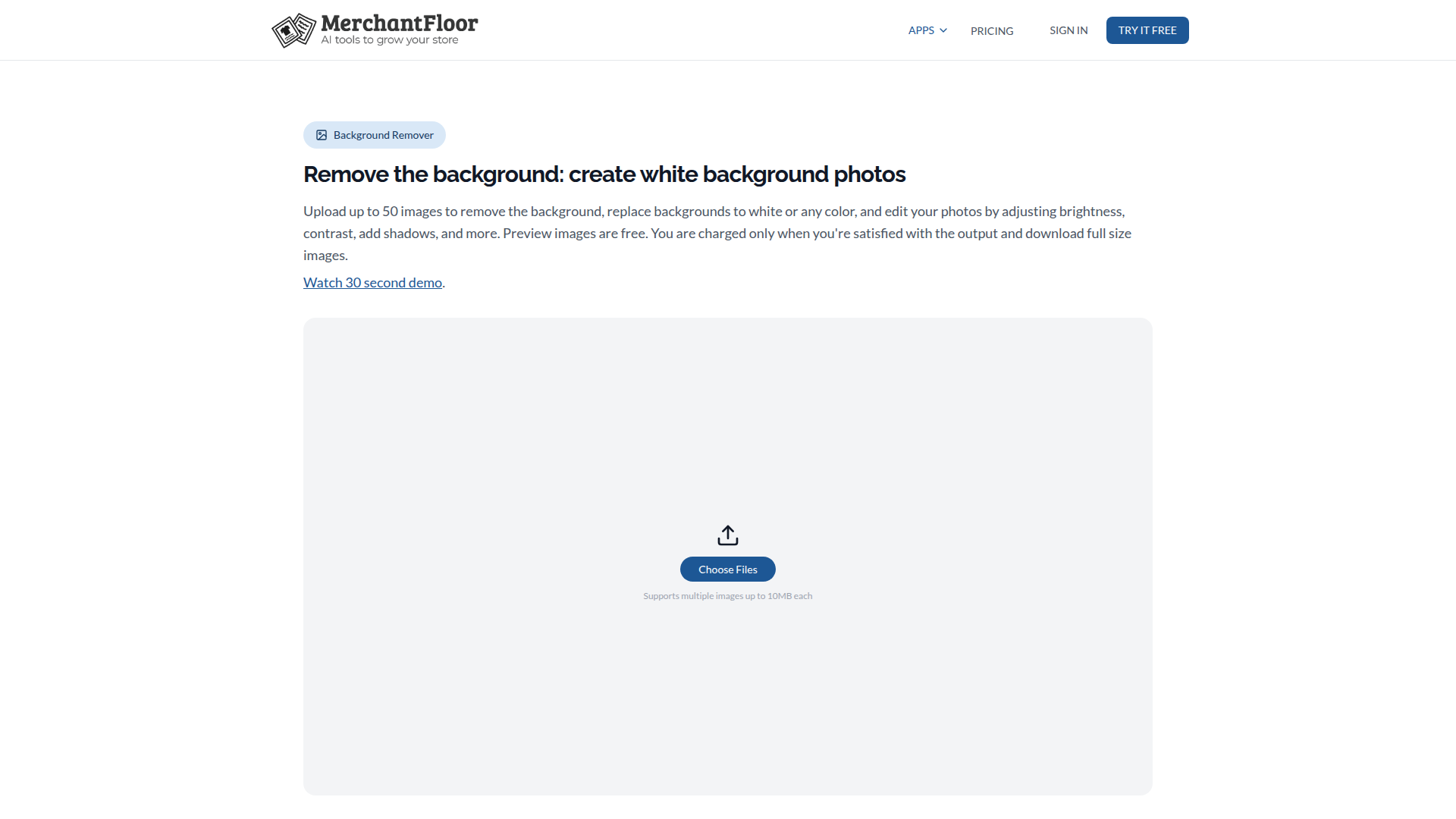Merchant Floor offers an AI background remover and basic photo editor aimed at e-commerce image preparation. The page focuses on removing backgrounds from product photos, replacing them with white or another color, and making simple visual adjustments before download.