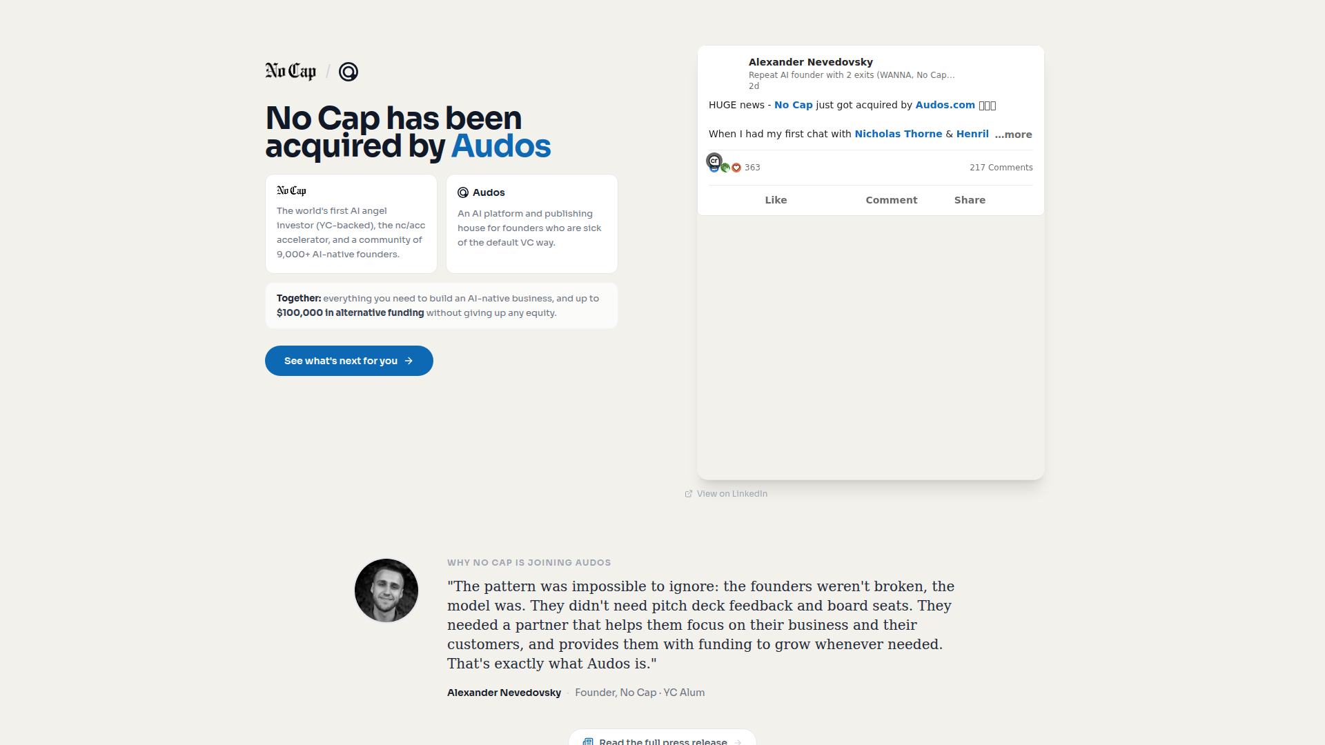 No Cap Acquired by Audos — AI Platform & Up to $100K for Founders | Audos