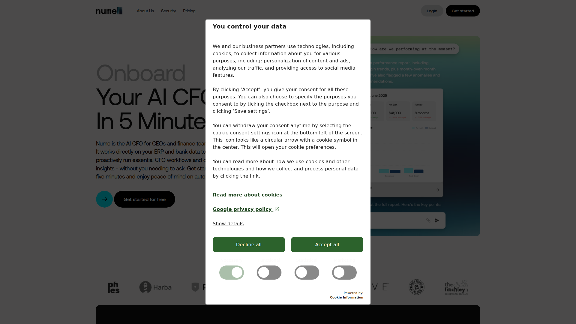 Nume presents itself as “the AI CFO for managing your finances.” Based on the provided page content, the product appears to be an AI-driven finance management offering focused on helping organizations oversee financial information and related workflows.