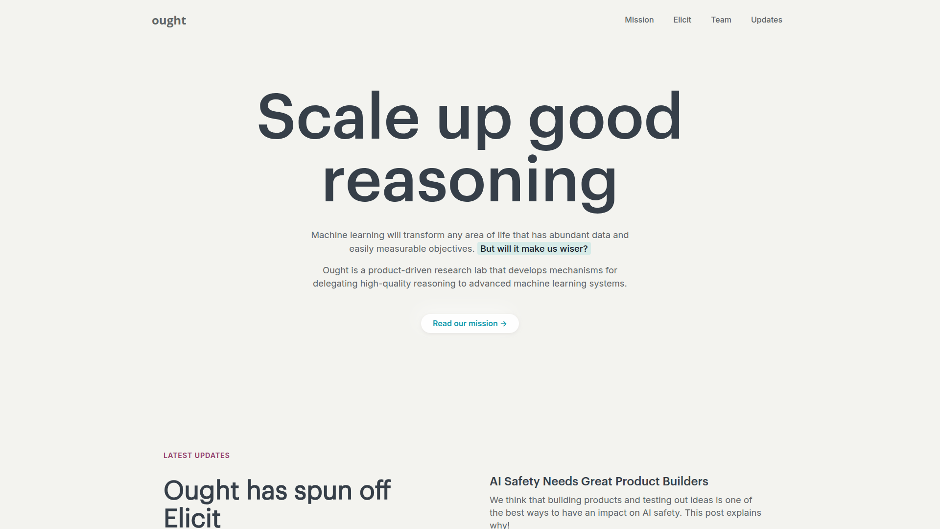 Ought is a product-driven research lab focused on developing ways to delegate high-quality reasoning to advanced machine learning systems. Its stated mission centers on improving how AI supports reasoning and judgment, especially in areas where machine learning alone may not automatically produce wiser outcomes.