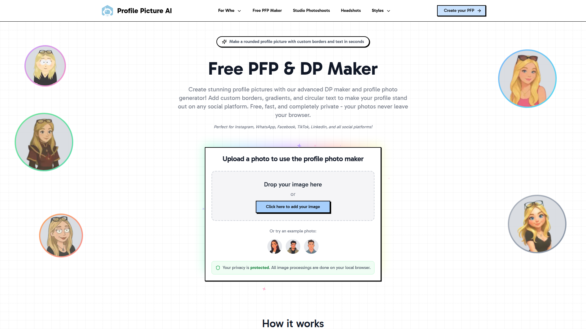 Profile Picture AI’s Free PFP Maker is a browser-based tool for creating circular profile pictures with custom borders, gradients, and circular text. It is aimed at people who want to quickly prepare display pictures for social and professional platforms such as Instagram, WhatsApp, Facebook, TikTok, LinkedIn, and similar services.