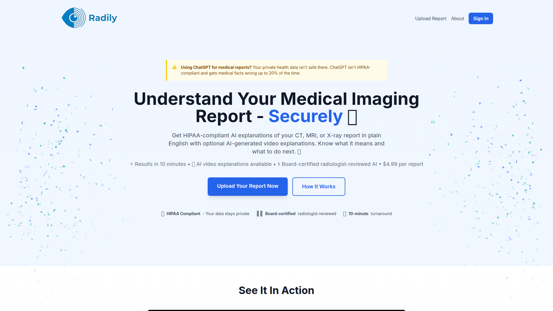 The workflow is straightforward: upload a radiology report, let the system analyze it, and receive a downloadable explanation. Radily appears positioned as a low-cost, privacy-focused interpretation layer for radiology documents rather than a replacement for clinical care; the site states the service is educational only and not a substitute for professional medical advice.
