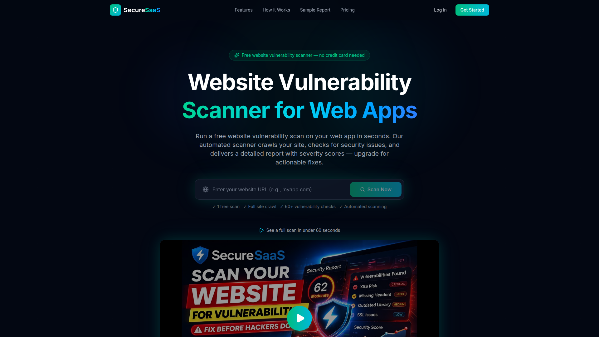 SecureSaaS is a website vulnerability scanner for web applications. It performs automated scans by crawling a submitted URL, checking for common security issues, and generating a report with severity ratings, vulnerability descriptions, and, on paid plans, fix suggestions.