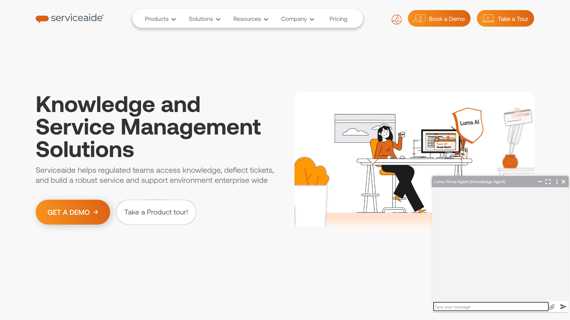Serviceaide provides enterprise digital management solutions centered on service management, knowledge management, change management, and AI-assisted support. Its product set includes the ChangeGear ITSM platform, Luma AI, Luma Knowledge, Service Desk, Service Manager, and related capabilities for handling incidents, requests, changes, assets, and service catalogs.