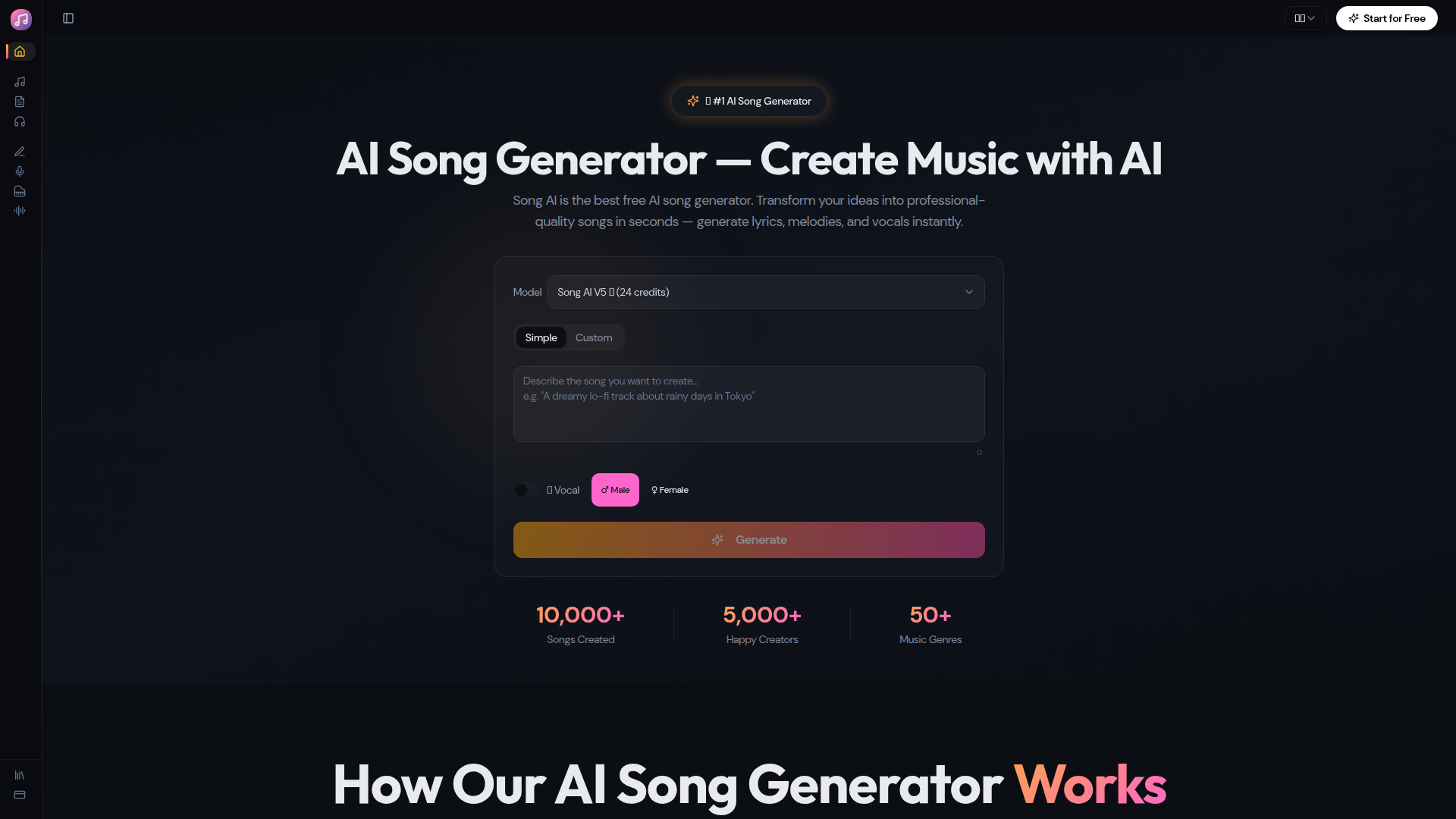 Song AI is a web-based AI music creation product that turns text prompts into complete songs. Based on the page, it is designed for creators who want to generate lyrics, melodies, vocals, and mixed audio quickly without traditional studio production steps.