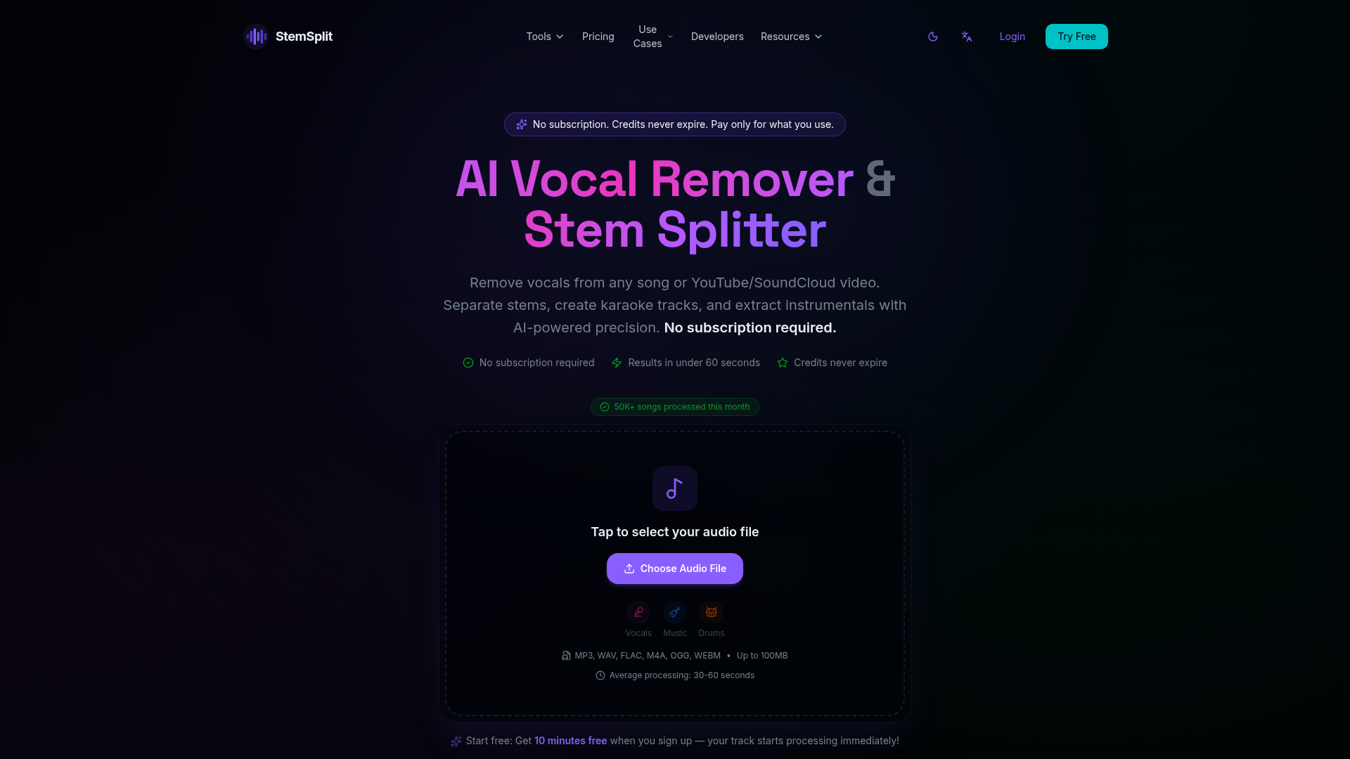 The product appears aimed at DJs, music producers, singers, karaoke users, content creators, audio editors, teachers, and developers who need fast stem separation without a subscription. Its positioning is a pay-as-you-go, self-serve web app with API access, focused on quick turnaround and flexible usage rather than recurring plans.
