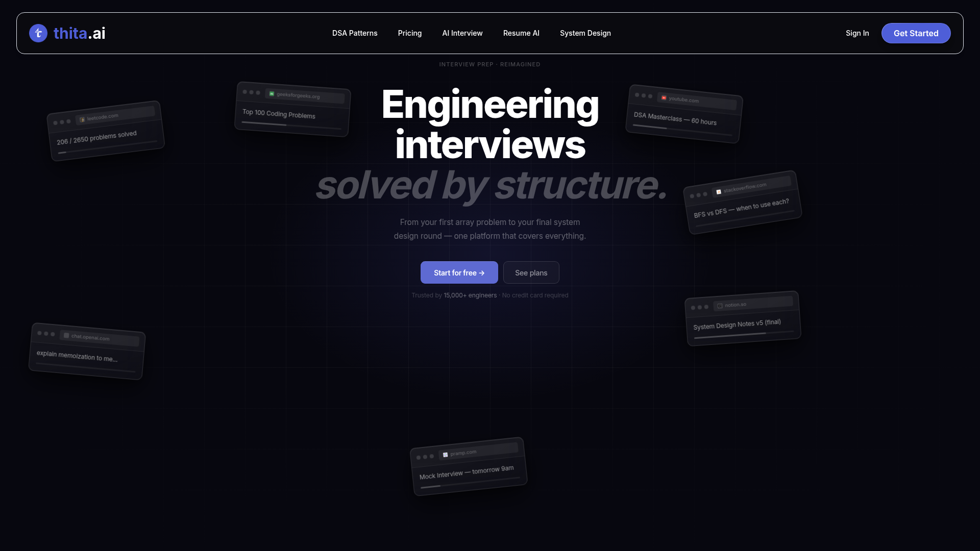 Thita.ai is an interview preparation platform for engineers and other technical candidates preparing for coding, system design, resume, and AI-related interviews. It combines structured learning content with AI-driven practice tools, including DSA pattern training, mock interviews, AI coaching, resume analysis, and learning tracks across areas such as Data Science, AI/ML, Product Management, and system design.