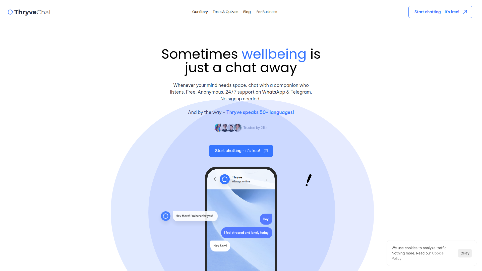 Thryve is a free AI wellbeing chatbot that provides anonymous, always-on conversational support through WhatsApp and Telegram. It is positioned as a lightweight, accessible companion for people who want space to talk, reflect, and receive guidance around wellbeing, mindfulness, fitness, nutrition, and related self-improvement topics without creating an account.