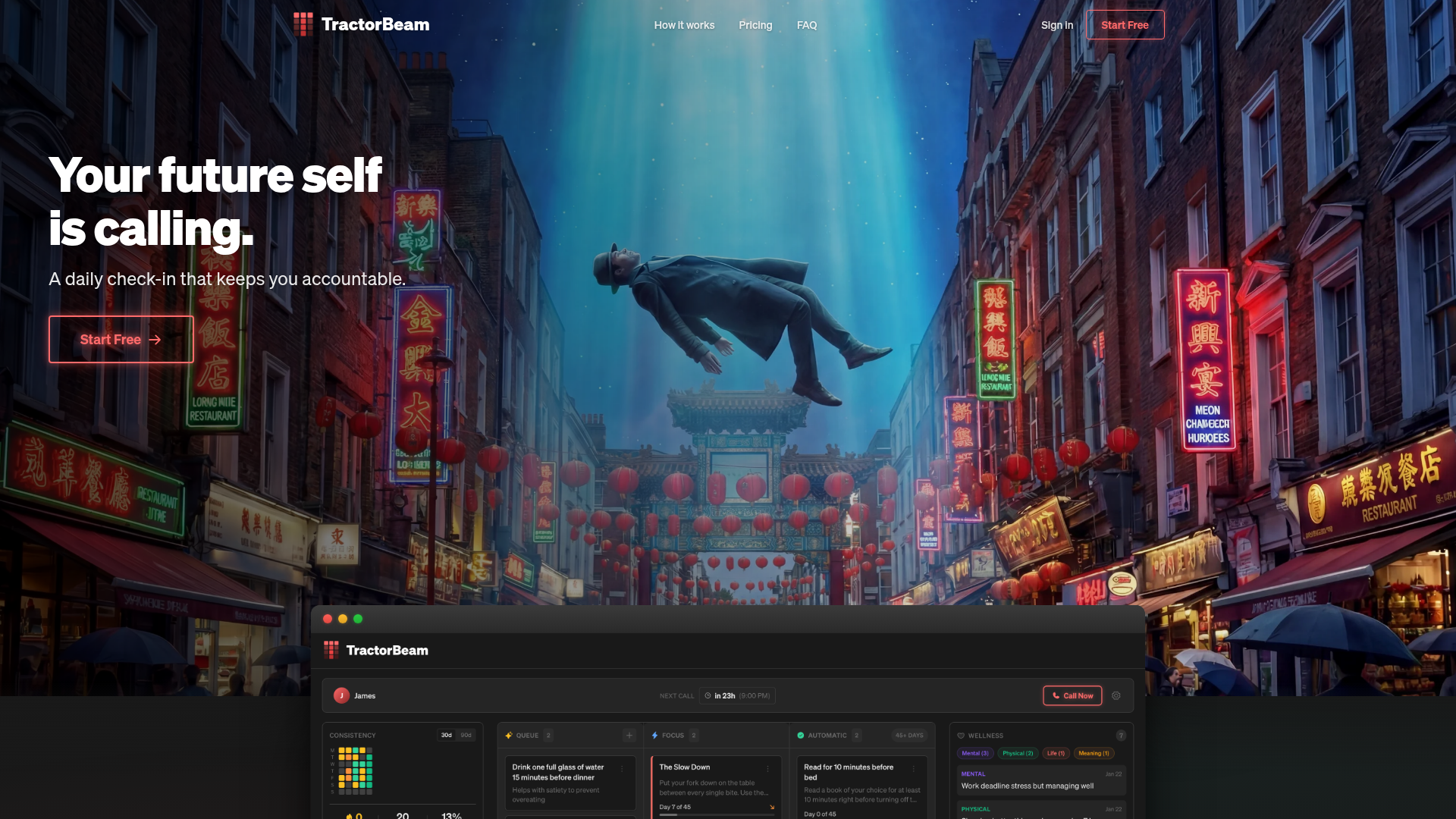 TractorBeam is an AI accountability product for personal habit building and goal follow-through. It uses daily or scheduled voice calls from an AI partner, plus text-based support and a live dashboard, to help people stay consistent with habits instead of relying only on self-tracking or passive app notifications.